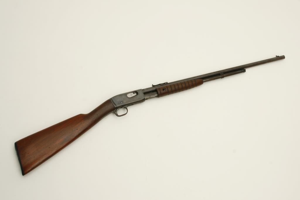 Short, Long or Long Rifle caliber, serial #507977. The rifle is in good overall condition with a 22” barrel. The barrel and receiver retain the majority of their thinning blued finish. The smooth wood stocks show use but remain in good condition with mars and compressions consistent with field use. The butt stock ends with a plastic, Remington marked butt plate. The bore is good, the action is crisp and markings are sharp. (Modern) Est.: $125-$250.