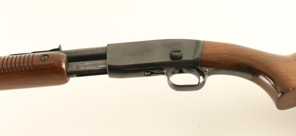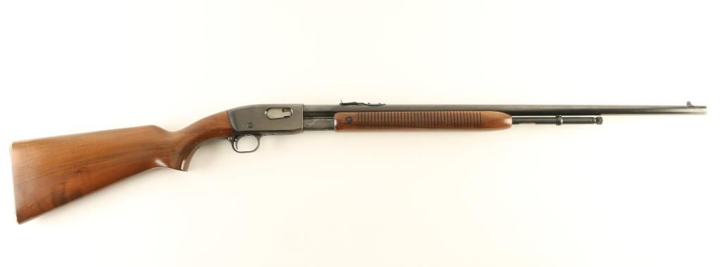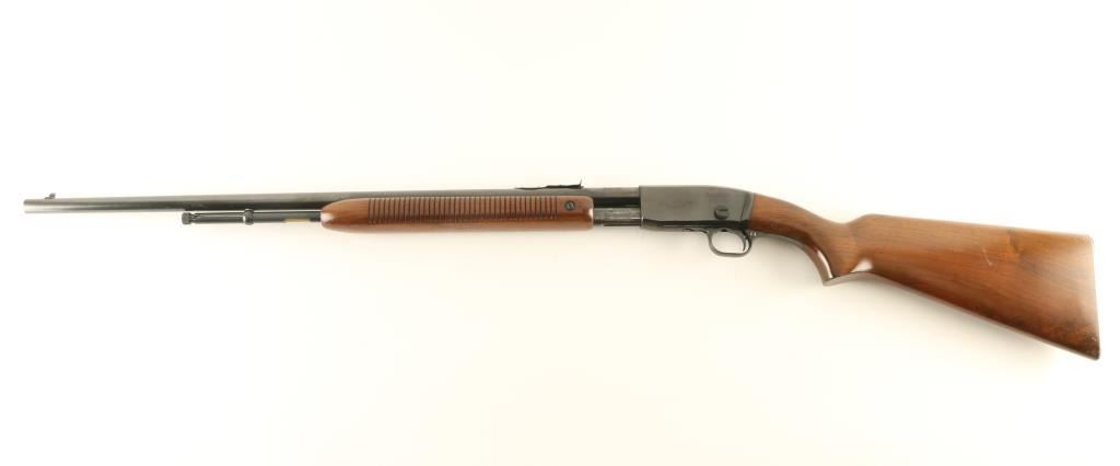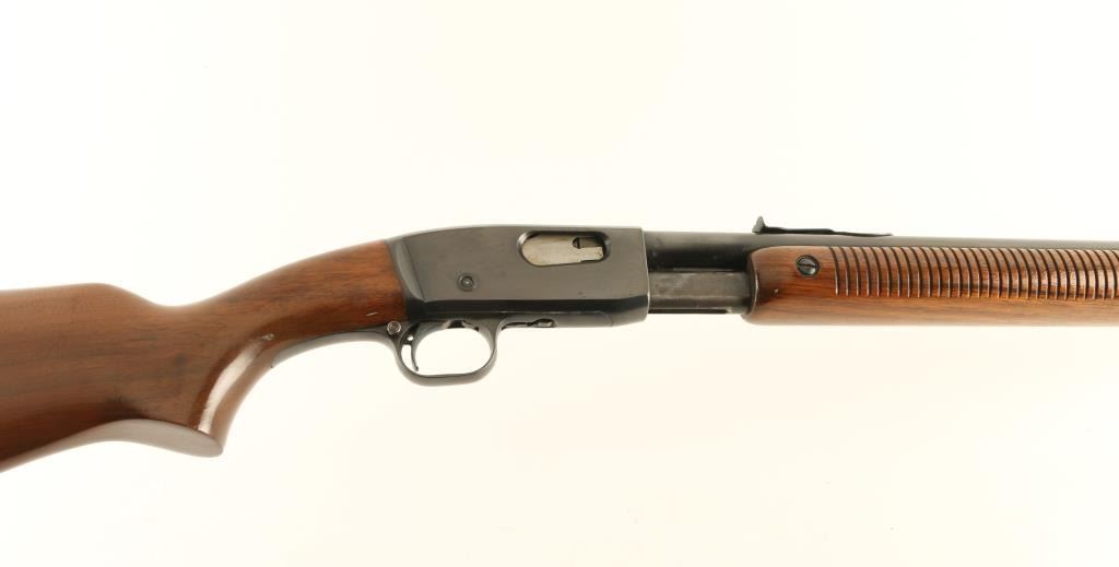 Pump action rimfire rifle features blued finish, grooved wood pump handle, wood stock with curved grip, flat metal buttplate, 24" barrel, buckhorn type sights, tube magazine under barrel, manual safety, takedown screw at receiver. Bore is very good condition. Retains 85% blue, with scratches & scrapes, some patina on receiver, bare metal on sharp edges & where action parts rub. Wood is good to very good condition with dents & scratches. Condition is NRA Very Good + *** C&R Firearm ***