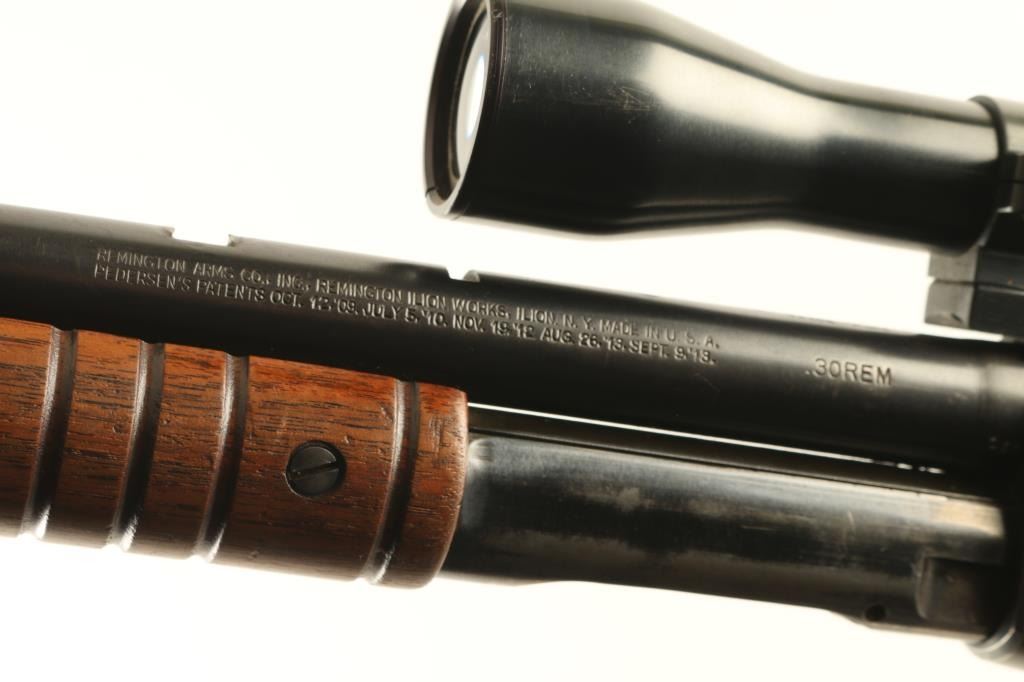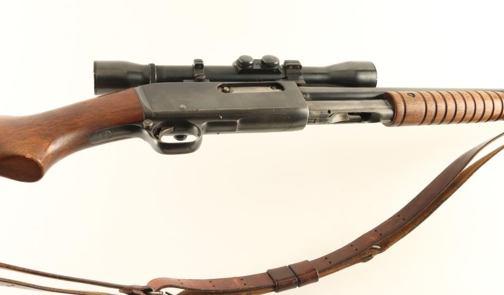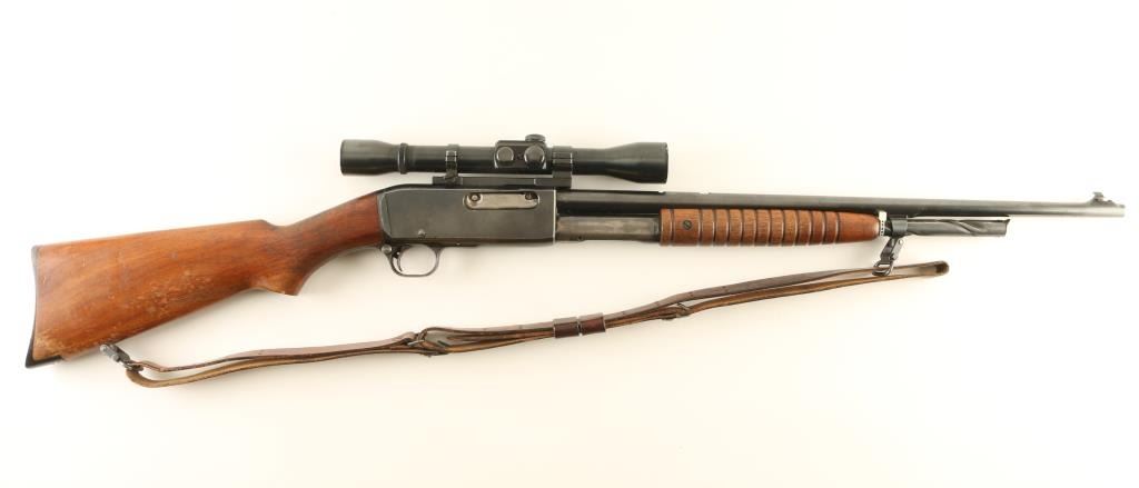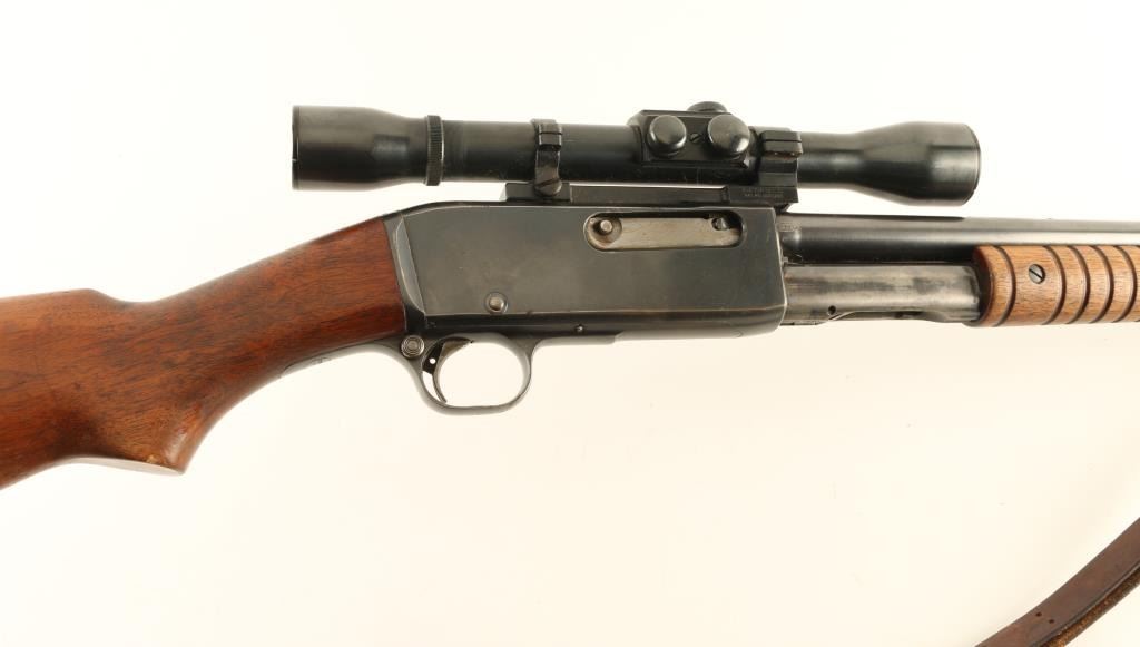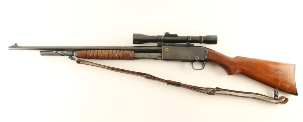 Pump action rifle manufactured circa 1930. Features blued finish, grooved wood pump handle, wood stock with curved grip, semi crescent steel buttplate, 22" barrel, blade front sight, two empty dovetails in barrel (no rear sight), one piece Redfield scope base & rings, tube magazine under barrel, manual safety, sling studs & detachable swivels, takedown screw at receiver. Brass cartridge head medallion attached to left side of receiver. Bore is good to very good condition. Retains 75% blue, with scratches & scrapes, bare metal on sharp edges & where action parts rub. Small areas of rust on buttplate. Wood is good condition with dents & scratches, some loss of finish. Mounts a good condition Weaver KV 2.75-5x scope with fine crosshair & clear view, some patina on exterior surfaces. Includes fair condition leather sling. Condition is NRA Very Good ++ *** C&R Firearm ***