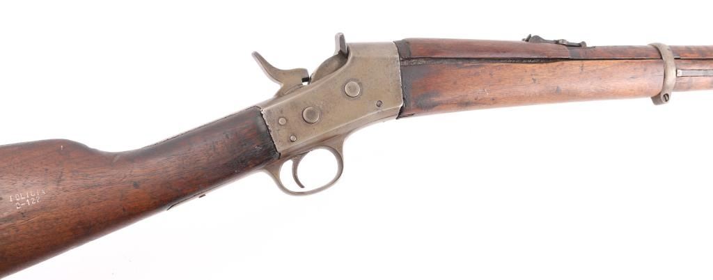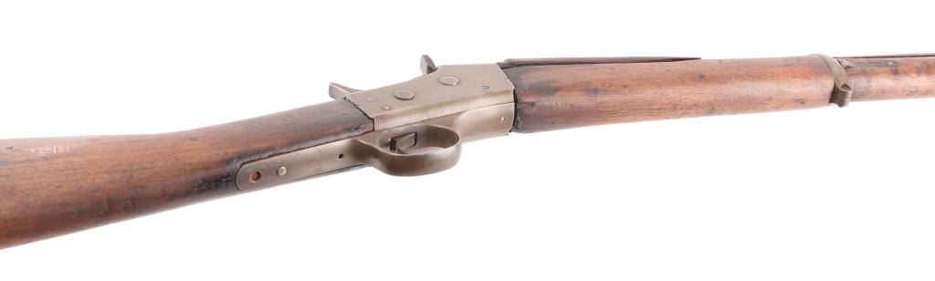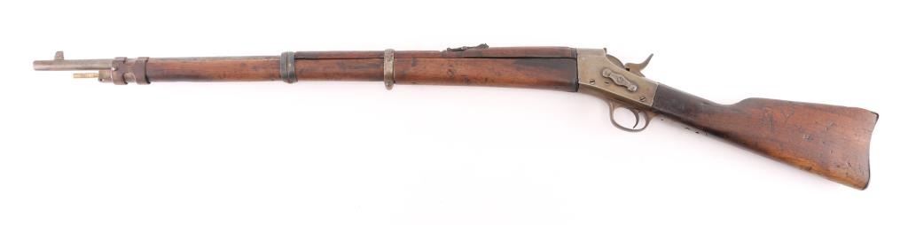 South American military/police contract rifle. Right butt stock stamped "Policia 2-122". Features 30" barrel with three bands, provision for cleaning rod (rod missing), bayonet lug, blade front & tangent rear sight, sling swivels. Tang marked with Remington Address, Patent date. Bore is rough/pitted with rifling present, action is smooth/tight. Blued finish has turned a mostly gray/brown patina with scattered pitting/rust spots. Wood is sound with numerous dents/scratches. NRA Condition-Fair. C&R Firearm.