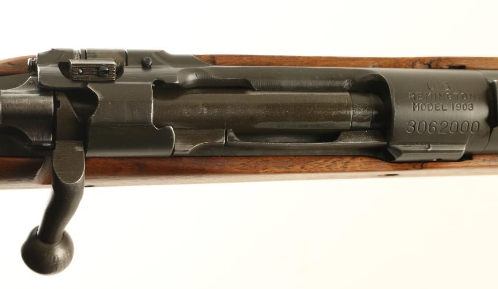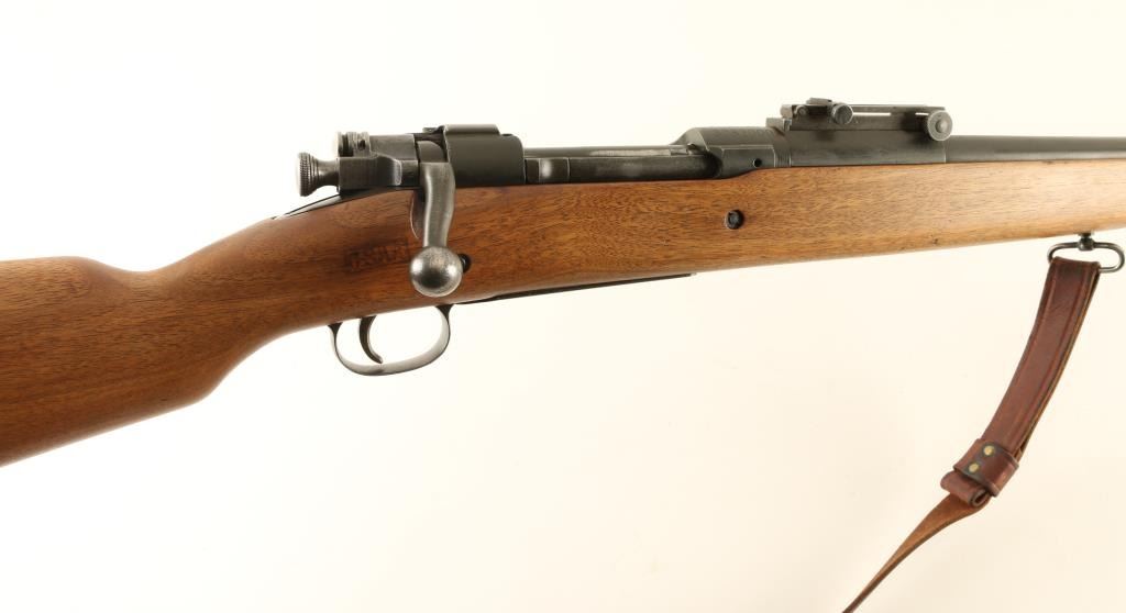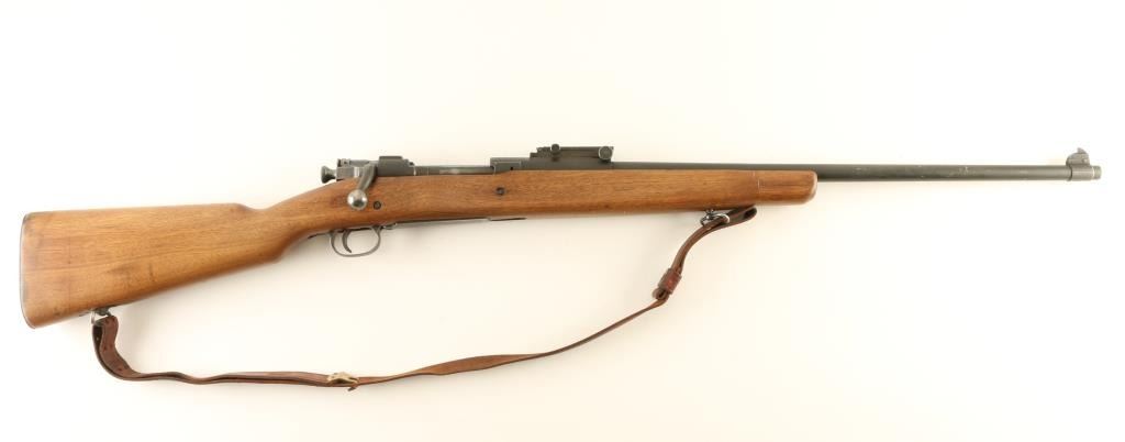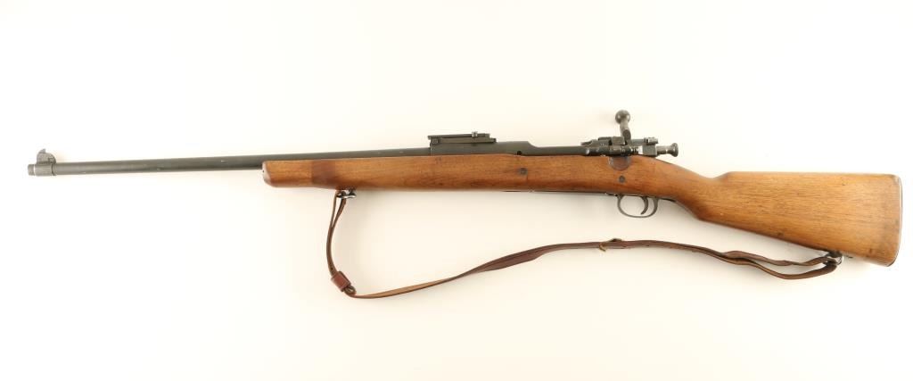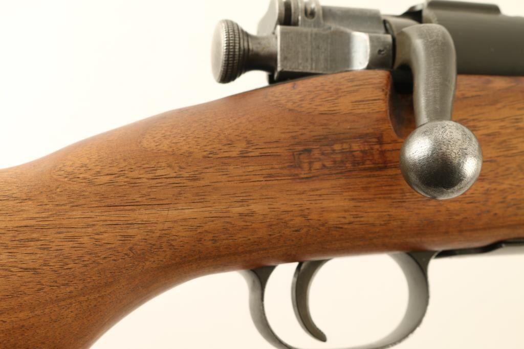 Rifle. Bolt-Action. Sporterized U.S. WW2 era Infantry Rifle. 24" barrel, with rear flip-up ladder aperture, and ramped blade front sights. Stock has been shorted to31.5", and sanded. "P" proof behind triggerguard. "GSAA" cartouche by the bolt cut-out. Leather sling attached. Thumb safety on bolt. Bore appears good, but dirty. Wood is good, with a small crack behind the tang. Proper U.S. markings on the receiver ring. Barrel marked R.A. , Flaming Bomb, and dated 1-42. Metal finish is parkerized gray. Action is smooth/tight. NRA Condition-Very Good, as sporterized. C&R Firearm.