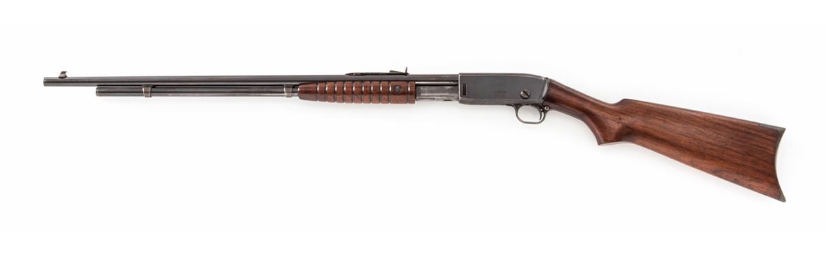 Remington Model 25 Slide Action Rifle, #26191, .32 WCF cal., 24'' barrel, blue finish, pistol-grip walnut stock with crescent buttplate. Condition is fine retaining approx. 92% blue. Stock with light scuffs and minor restoration. Action is good, bore is bright. Est.: $300-$500. (C&R)