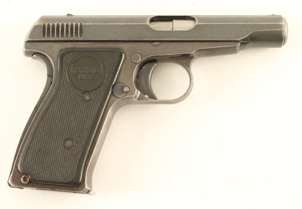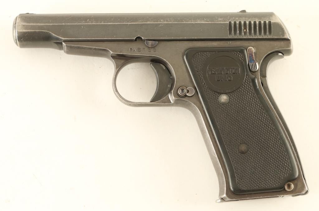 Semiautomatic pistol features blued finish, checkered black plastic grips with "REMINGTON UMC" logo, 3.5" barrel, fixed sights, push button magazine release, grip safety, manual safety. Bore is very good condition. Retains 80% graying colored blue, with bare metal on most sharp edges. Grips are good condition, worn slightly smooth, no visible cracks. Includes one magazine. Condition is NRA Very Good *** C&R Firearm ***