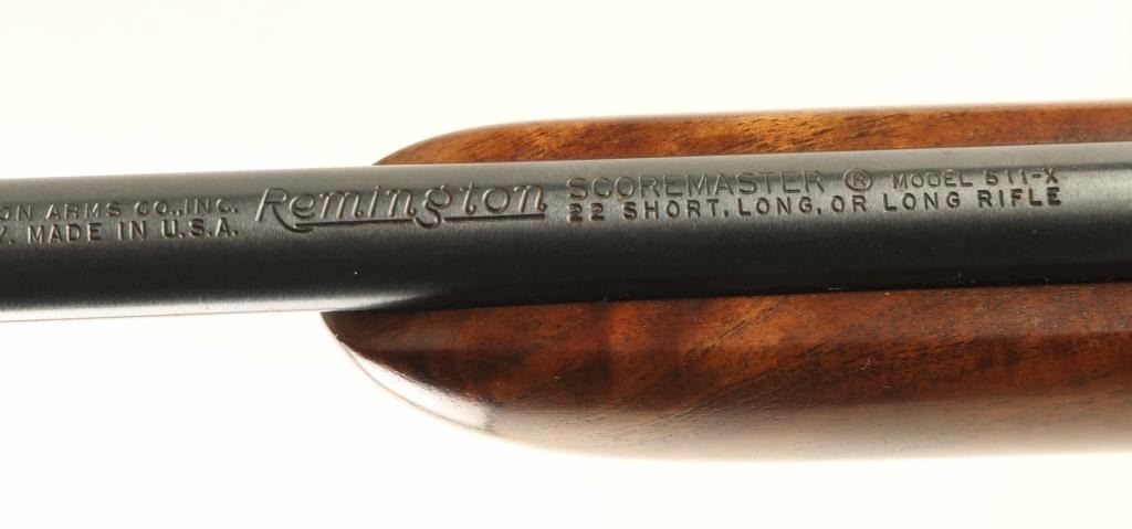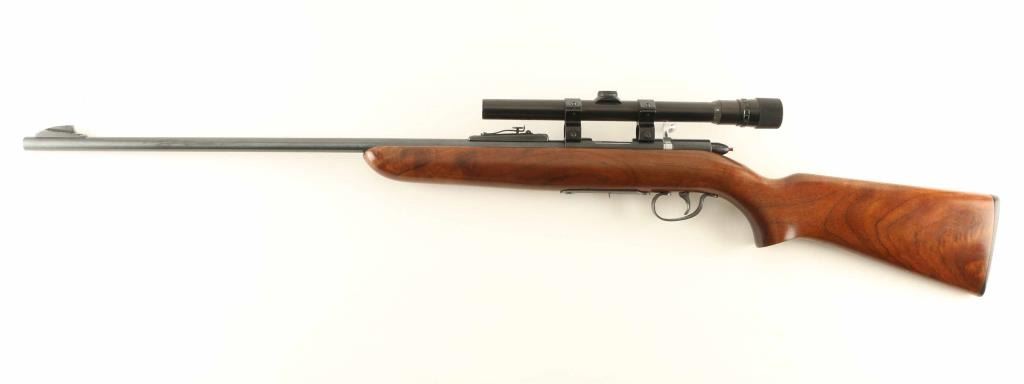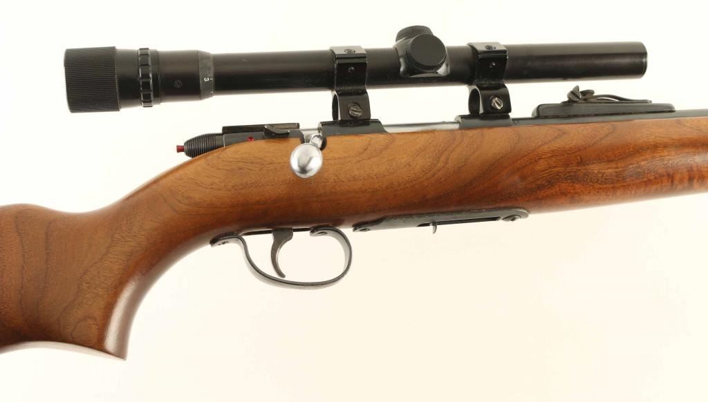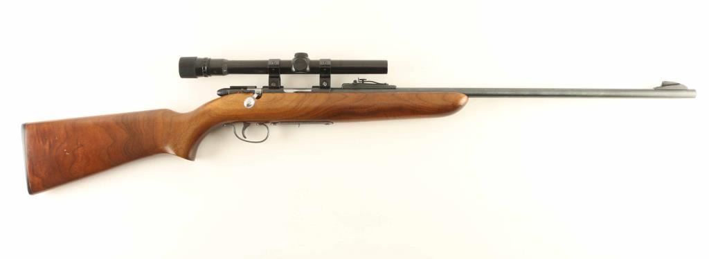 'Scoremaster' Bolt action rimfire rifle features blued finish, smooth wood stock with curved grip, flat plastic buttplate, 24" barrel, blade front sight, adjustable rear sight, detachable box magazine (missing), manual safety. Bore is very good condition. Retains 80% blue, with scratches & scrapes, bare metal on sharp edges, small areas of patina forming in places. Wood is very good condition with dents & scratches. Mounts a very good condition Weaver V22-A 3-6x scope with duplex reticle, good view. Condition is NRA Very Good + (missing magazine) *** C&R Firearm ***