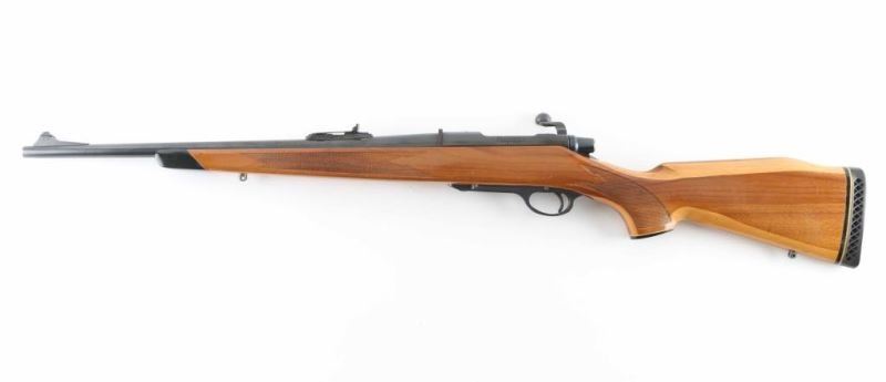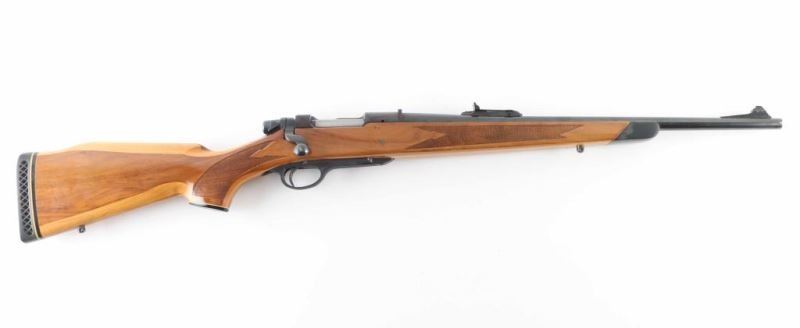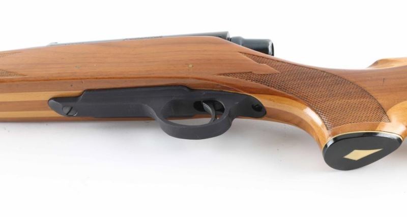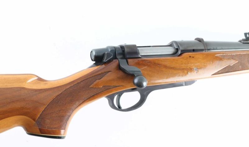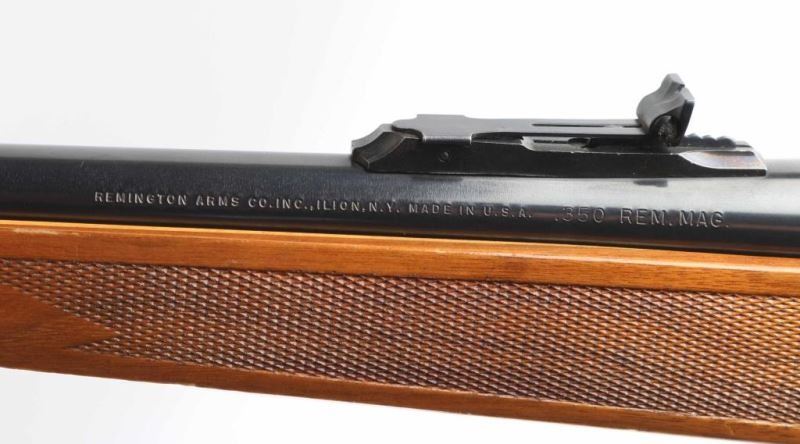 The Remington Model 660 is a push feed, bolt-action rifle manufactured by Remington Arms from 1968 to 1971. The rifle was intended as a replacement for the Model 600 but itself was replaced by the Mohawk-600. This gun has a 20" blued barrel with raised front sight, adjustable rear sight and is chambered in .350 Rem. Mag. The laminated stock has a black forend cap that has had the gloss finish sanded off the right side for some reason. There is a nice grip cap, swivel studs, factory recoil pad and a blind mag well with checkering at the wrist and forend. The receiver is drilled and tapped. The barrel and receiver look good with only a small amount of wear showing at the muzzle. The bore and rifling look good. NRA Very Good Modern Firearm