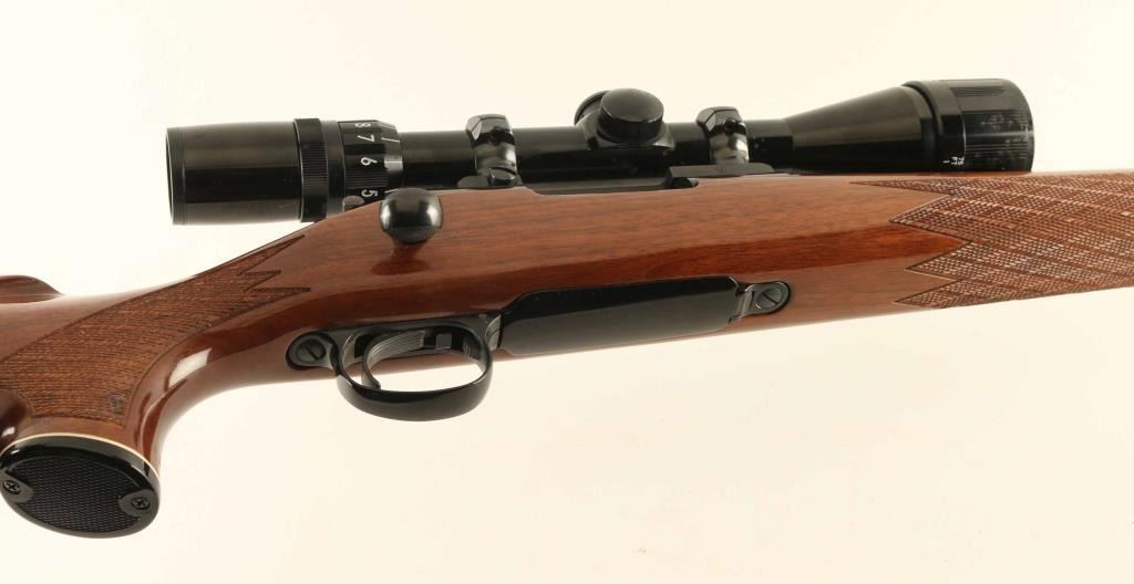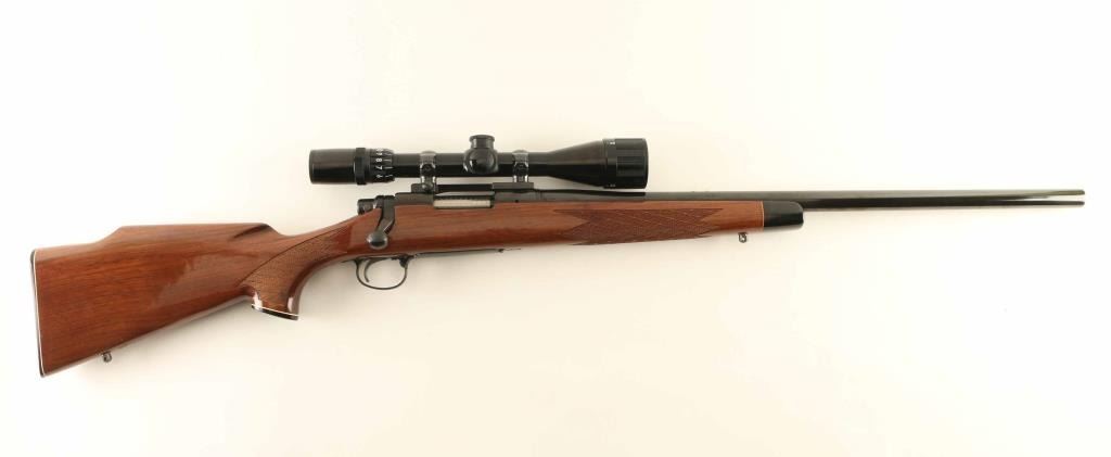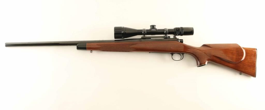 Rifle. Bolt-Action. BDL Varmint Special. 2-Lug rotating bolt. Internal box magazine. 23" contoured, round heavy barrel. No sights. Blued finish. Right mounted thumb safety. laminated Monte-Carlo style stock, with black pistol grip, and forearm caps, with white spacers. Sling swivel studs. Bore appears excellent/bright. Action is smooth/tight. Blued finish is about 99%, with a couple of very minor scratches. Wood is excellent. NRA Condition-Excellent. Modern firearm.