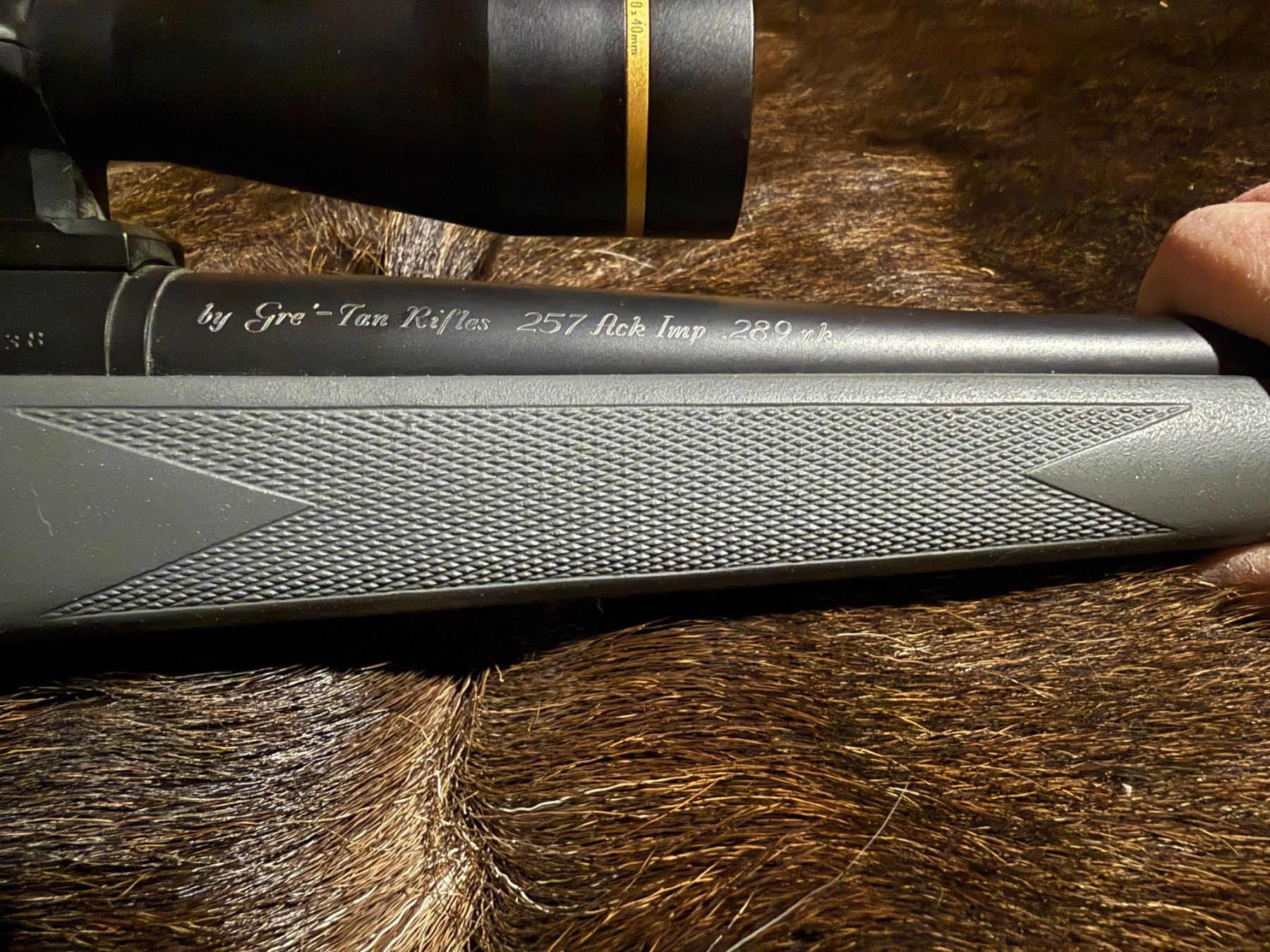 Caliber: .257 Ackley Improved. A favorite among handloaders for its flat trajectory and ""fire-forming"" capability.
