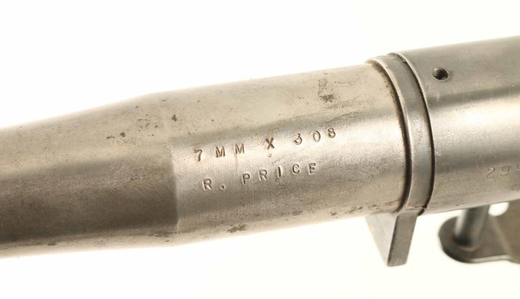 Barreled action only - no stock. Features 26" barrel, marked "R. PRICE". Barrel has very good bright bore, outside is rough turned with minor machining marks and dings in places. Action is blued, good condition, drilled & tapped on top of receiver and left side of bridge, small patina spots on bolt body. No safety or bolt stop parts present. Bolt does not cock - sear needs adjusted or parts replaced. Condition is NRA Good - for rebuilding - not functional *** Modern Firearm ***