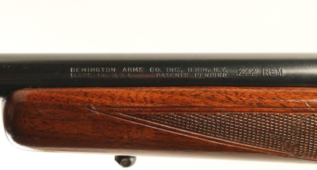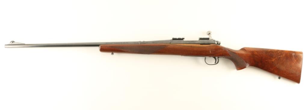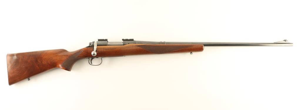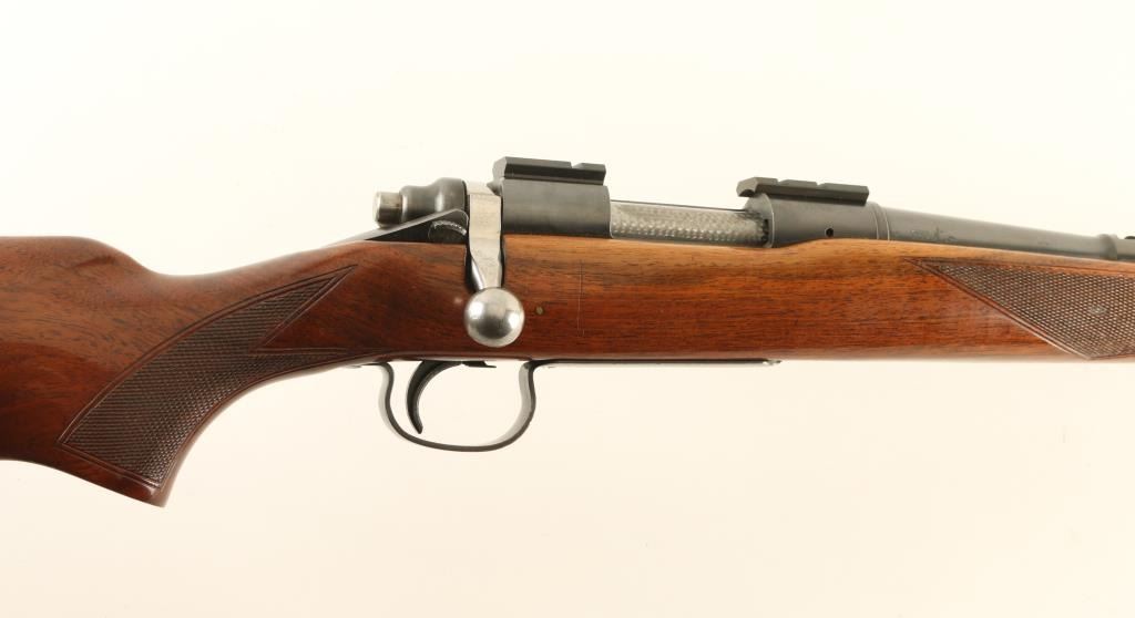 Bolt action rifle manufactured circa 1952, features blued finish, bright metal bolt, fancy figured wood stock with checkering at forend & wrist, no cheekpiece, flat aluminum buttplate, sling studs, 26" barrel, blade front sight, empty dovetail mid-barrel where rear sight was removed, two piece Weaver type bases mounted to receiver top (no rings, no scope), blind magazine, manual safety. Bore is excellent condition. Retains 90% blue, with handling marks. Bottom metal has areas of patina, thinning blue at edges. Wood is very good condition with scratches and scuffs. Condition is NRA Very Good ++ *** C&R Firearm ***
