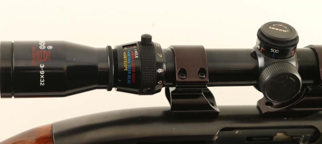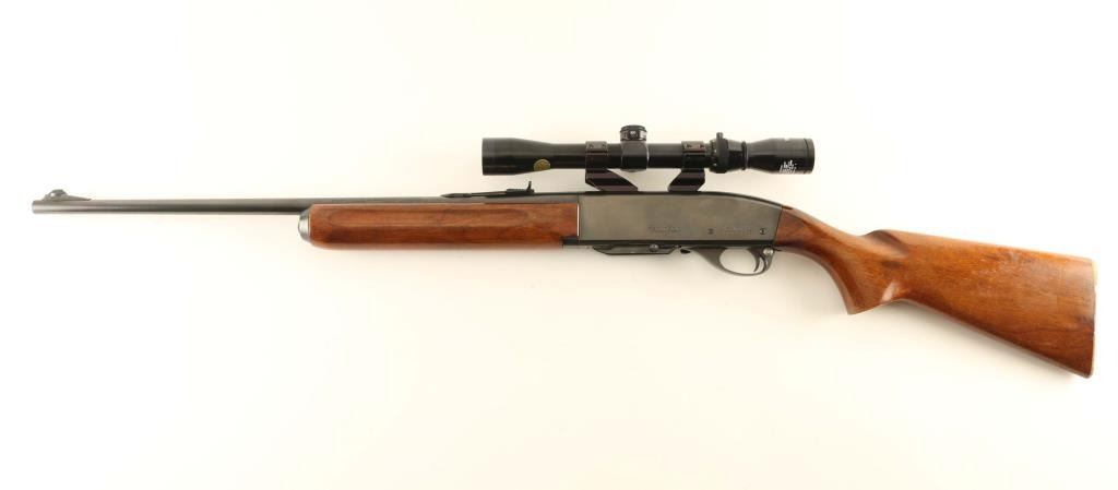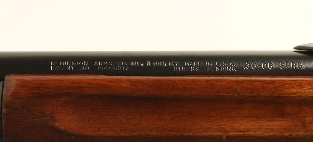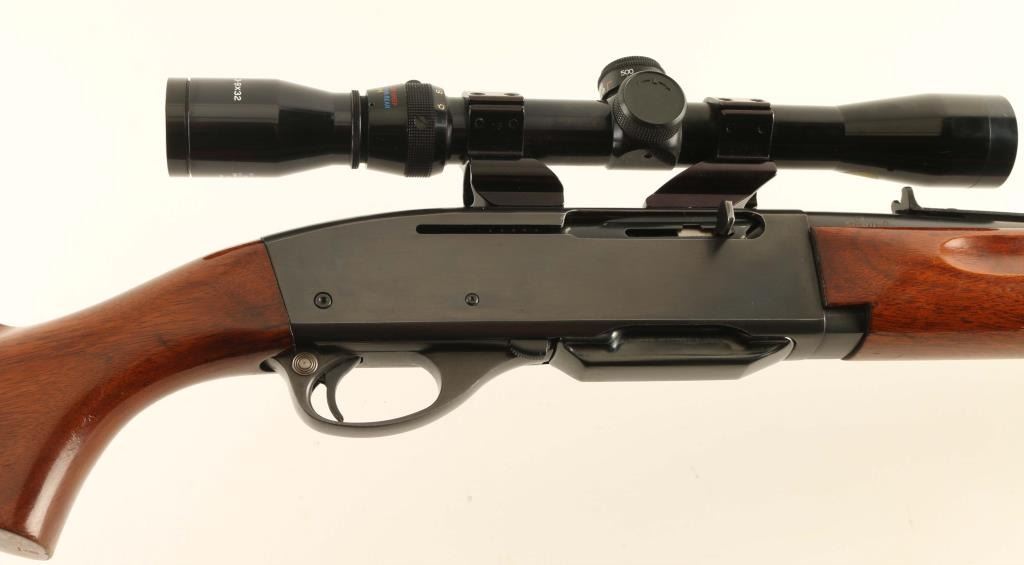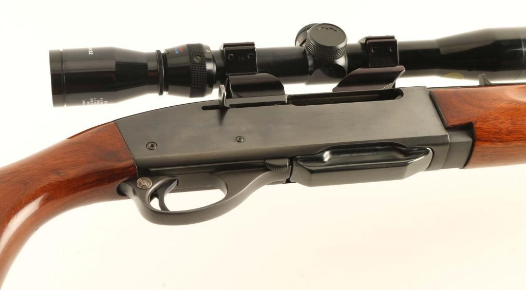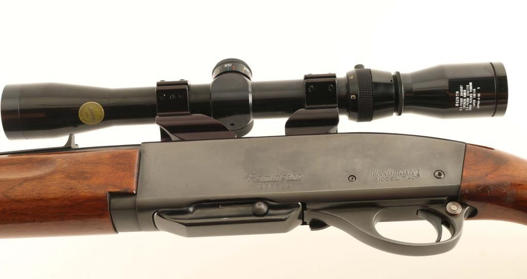 'Woodsmaster' Vintage magazine fed semi-automatic sporting rifle chambered in .30-06 Springfield, manufactured in Ilion, NY circa 1956. Features a blued finish, 22" tapered barrel, ramped blade front sight with bead top, elevation adjustable rear sporting sight, Tasco 3-9x 32mm scope mounted with see-through rings, smooth trigger, alloy trigger guard with cross-bolt safety, detachable 4 round box magazine, smooth walnut forend with gasping grooves and semi-pistol grip shoulder stock with serrated metal buttplate & 13 ½” LOP. Rifle retains approximately 98% of its original blued finish showing wear on the top of the receiver from a previously installed optic mount and a few scattered spots of emerging rust. Action is crisp, the bore is pristine, the optics are slightly hazy and refinished wood stocks are very good with a couple 3/8” cracks in the wrist extending from the right side of the receiver. Condition is near NRA Very Good. ***C&R Firearm***