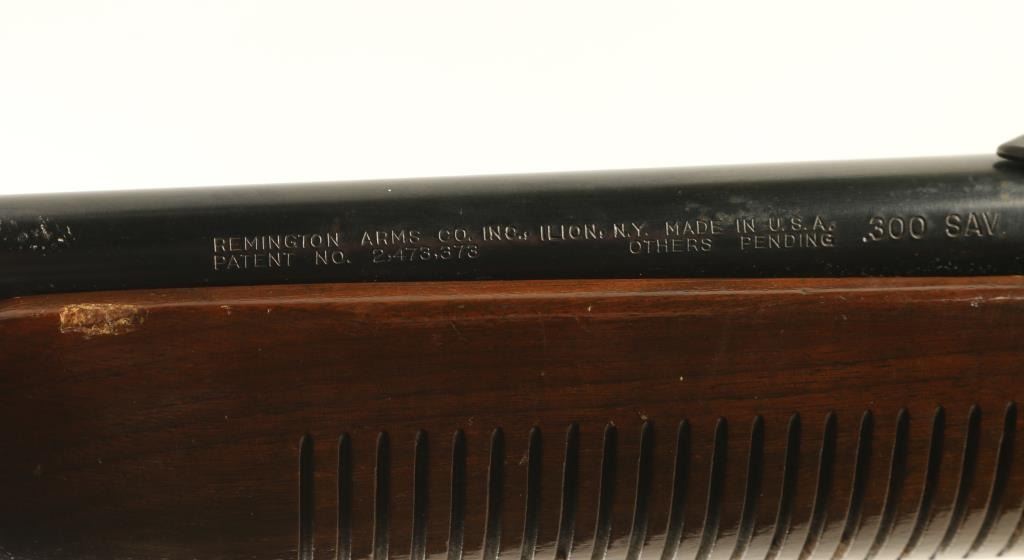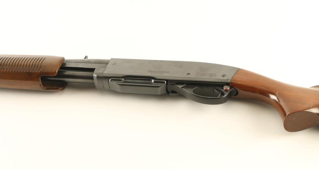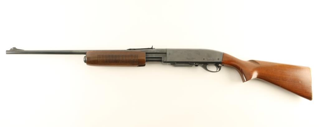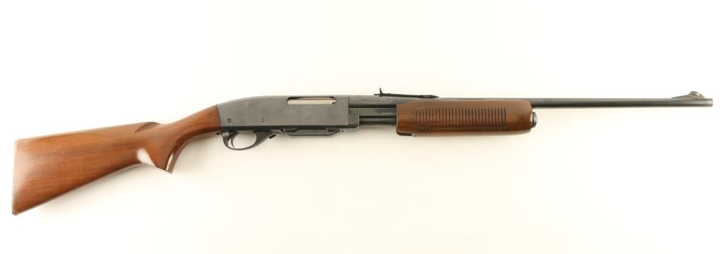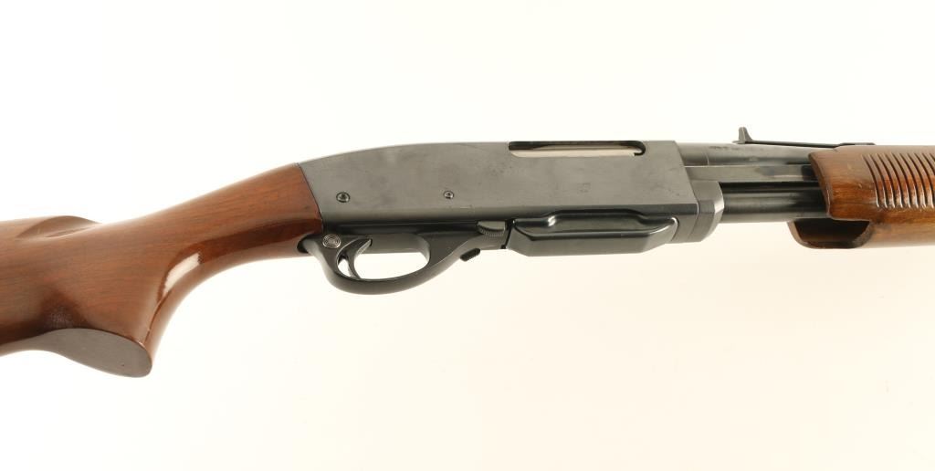Pump action rifle features blued finish, grooved wood pump handle, wood stock with curved grip, flat metal buttplate, 22.5" barrel, buckhorn type sights, detachable box magazine, manual safety. Bore is very good condition. Retains 80% blue, with scratches & scrapes, light scattered patina forming on receiver sides, bare metal on sharp edges & where action parts rub. Wood is very good condition with dents & scratches. Condition is NRA Very Good *** Modern Firearm ***