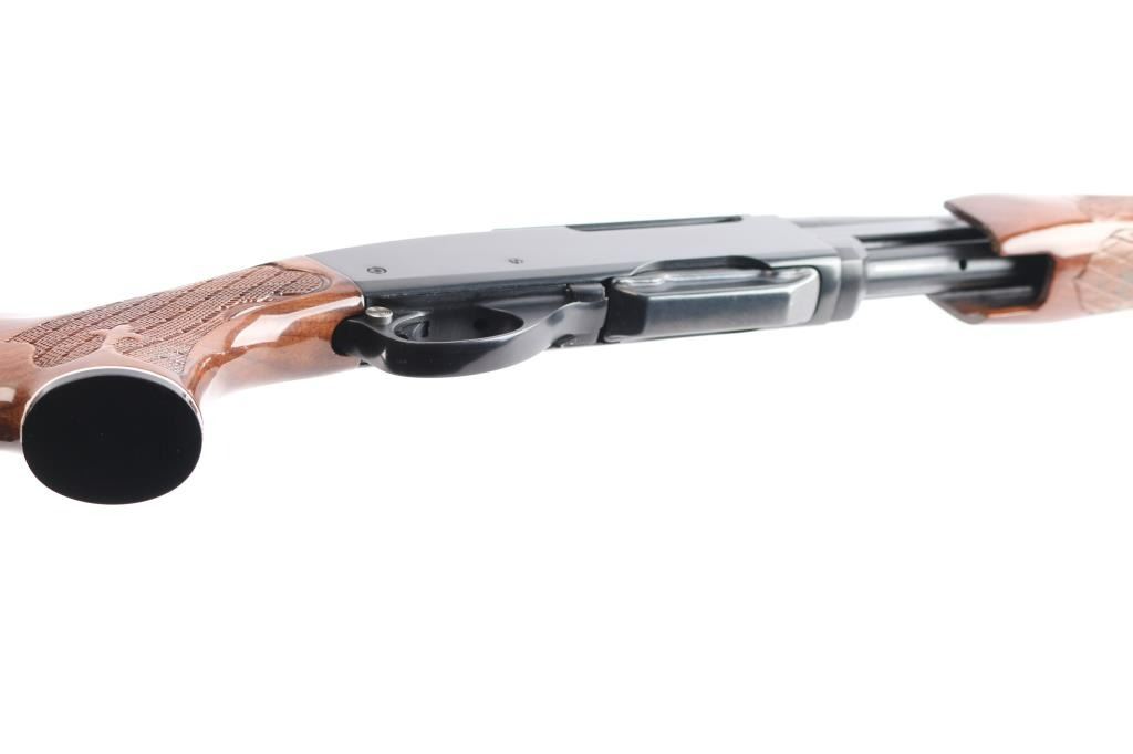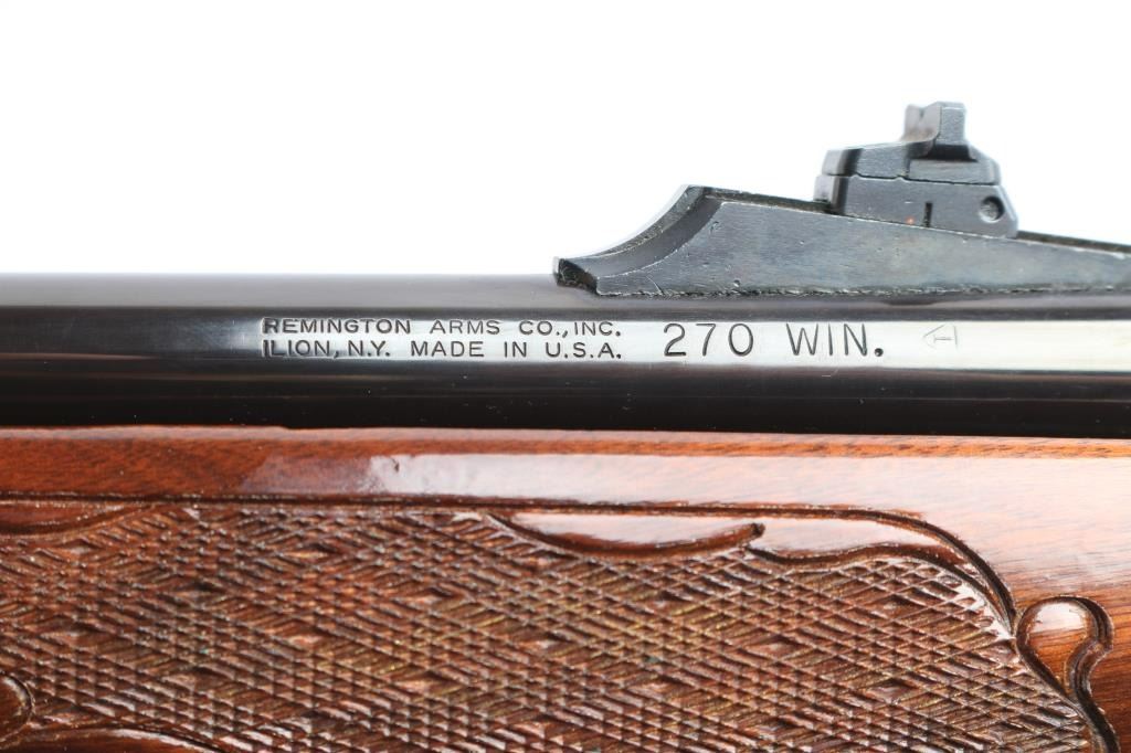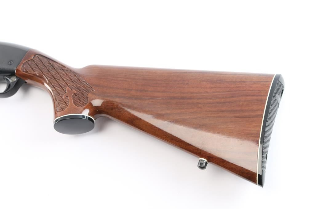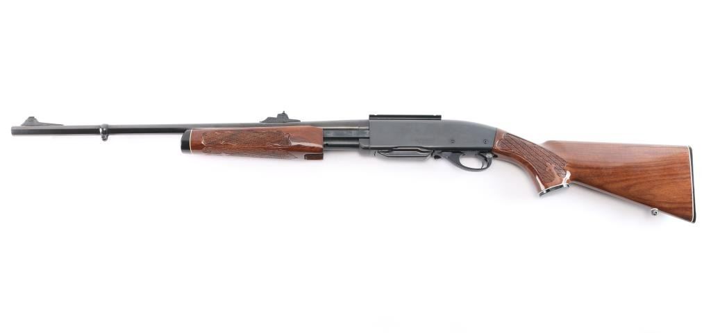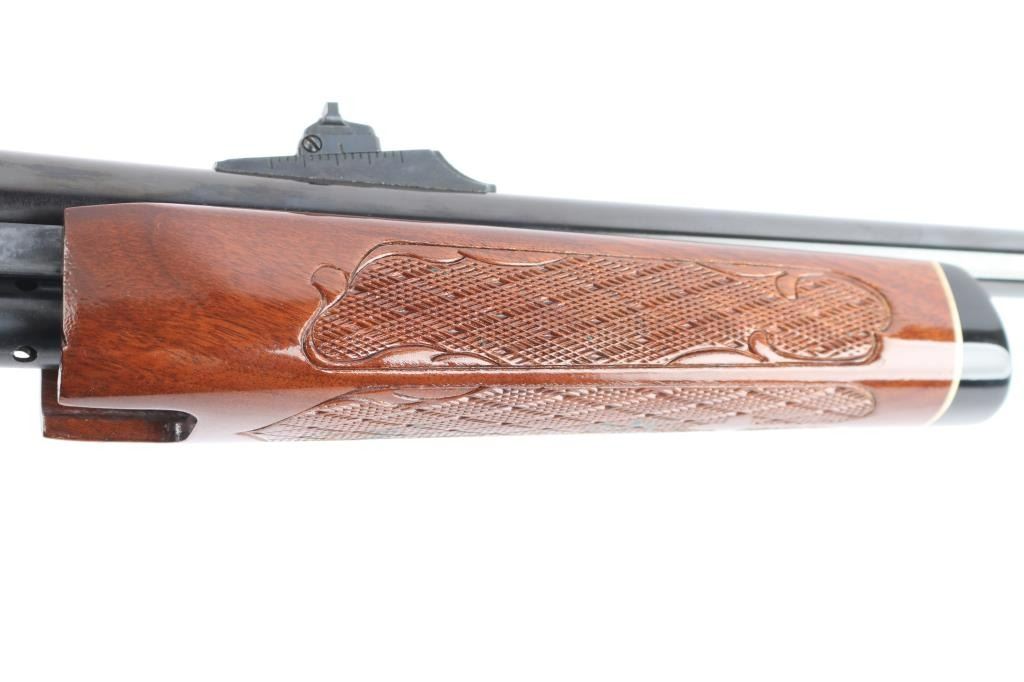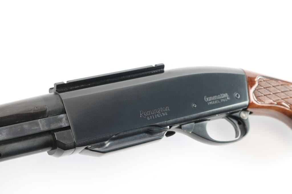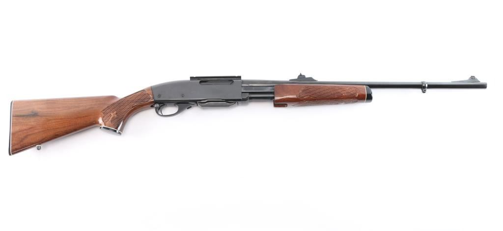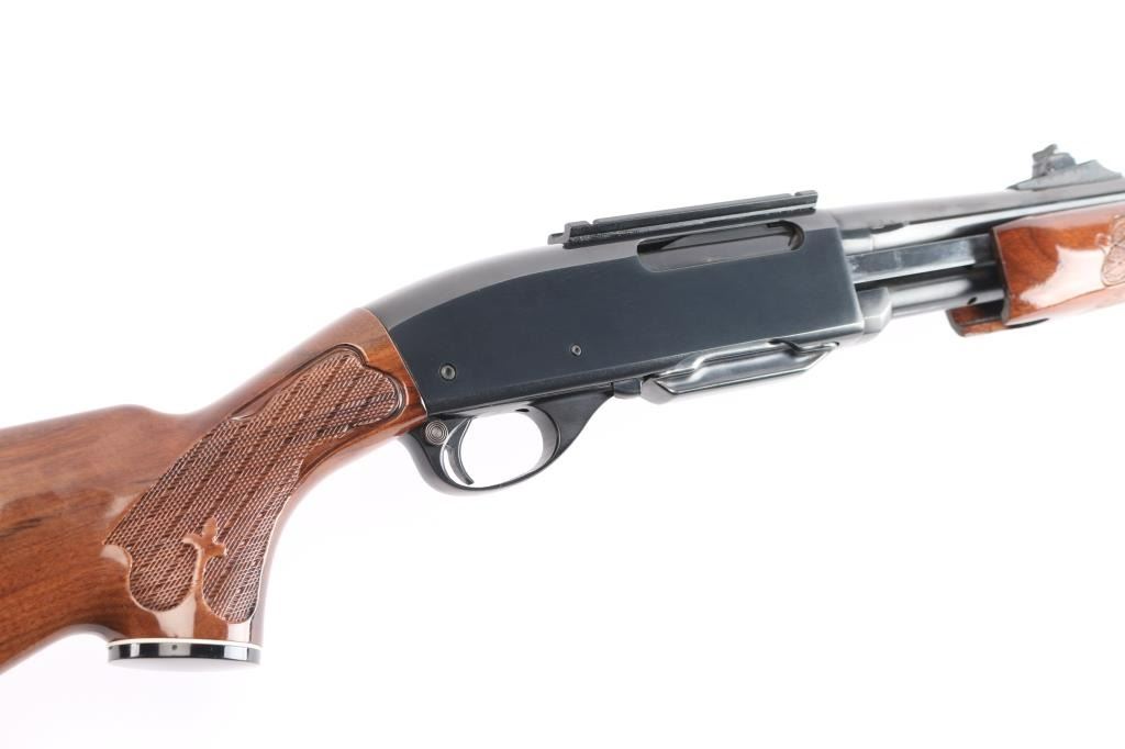 'Gamemaster' Pump action rifle Manufactured by Remington Arms Co. in Ilion, NY. It features a blued finish, checkered wood pump handle and wood stock with semi-pistol grip and serrated black plastic buttplate, grip cap with white spacers, 22.5" barrel, blade/bead front sight, adjustable sporting rear sight, detachable box magazine, sling studs, smooth curved trigger, and a manual cross-bolt safety. Bore is excellent/bright with strong rifling. Retains about 99% blue, Very little friction wear on the action bar. Wood is in excellent condition with no noticeable handling marks. Action is smooth. It is utilizing Weaver rail. Manufactured 1979. (CV date code)