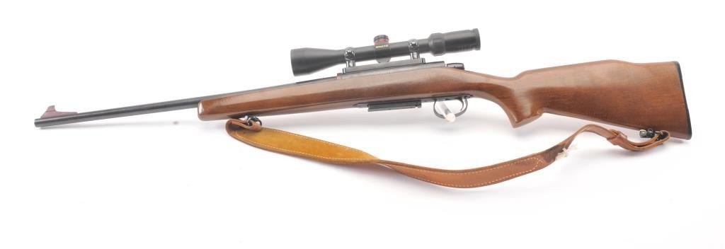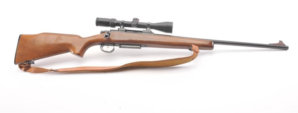 Remington Model 788 bolt action rifle, .243 Winchester caliber, Serial #6121643. The rifle is in fine overall condition with a 22” barrel. The rifle retains approximately 92%-94% of the factory blue finish withstorage marks. The smooth wood stock is in very good condition with small mars and scrapes consistent with field use. The stocks has sling swivels, leather sling and ends with a plastic butt plate. The rifle is topped with a Weaver one-piece mount and a Simmons 3 x 9 variable power scope. The bore is good, the action is crisp and the markings are sharp. The lot includes one correct magazine. Est.: $300-$600.(Modern).