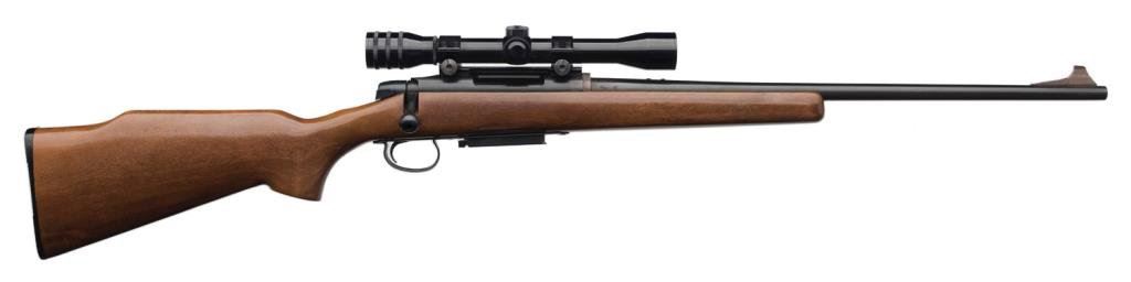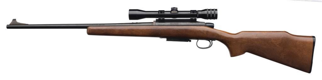 *Remington Model 788 bolt action rifle, .308 Winchester cal., serial #6127290. The rifle is in overall very good to nearly excellent condition with a 22” blued barrel with a ramp front sight. The rear sight has been removed for scope clearance. The barrel and action retain nearly all of the original blue finish with only small handling marks and scratches on the underside of the barrel. The smooth wood stock is in overall excellent condition showing only small marks from storage. The butt stock is completed by a Remington marked hard plastic butt plate. The bore is excellent, the action crisp and markings sharp. The rifle is topped with a two-piece scope mount and Universal fixed power scope. The rifle comes with one correct magazine. Est.: $300-$600.