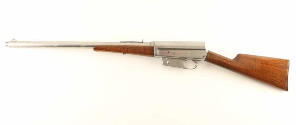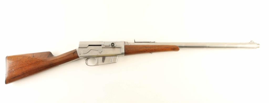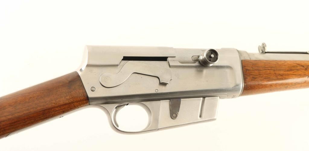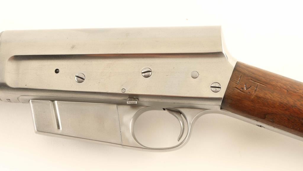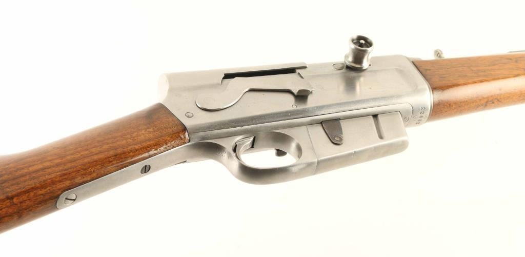 Semiautomatic rifle has been cleaned of almost all blued finish, is in the white. Features two piece stock with straight grip, Gutta Percha buttplate, 22" barrel, buckhorn sights, fixed 5 round magazine, manual safety. Bore is fair to good condition, frosted grooves with fairly good lands. Bare metal surfaces are clean, bright, with some scuffing or small scratches, visible dent to barrel jacket. Missing stepped elevator from rear sight. Bolt hold open/release button appears to be missing its spring. Wood appears sanded & varnished, with fair fit to metal at tang. Wrist has carved letter "V" in a box approx 1/2" high, on left side. Buttplate is fair to good with a few chips missing from edges. Condition is NRA Good *** C&R Firearm ***