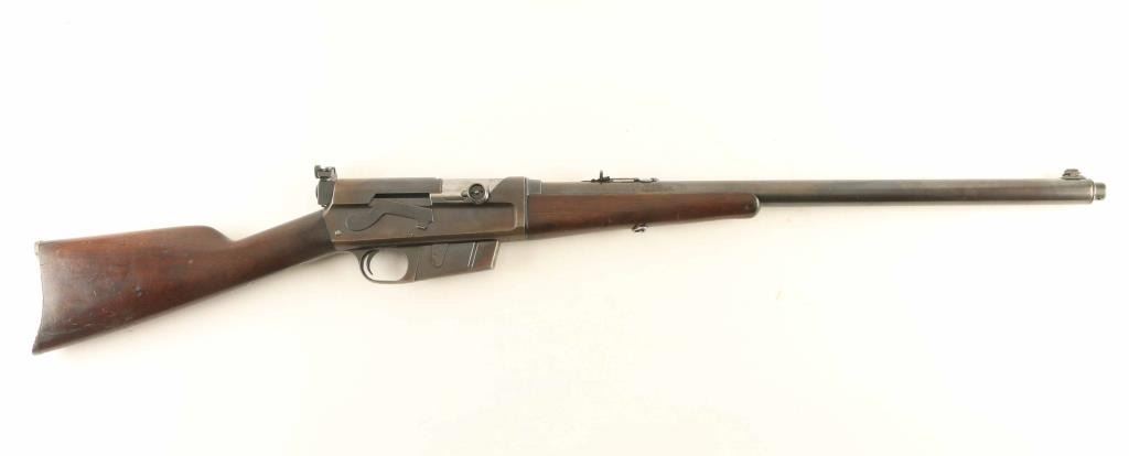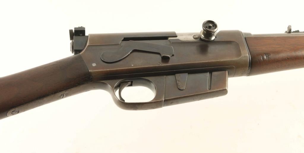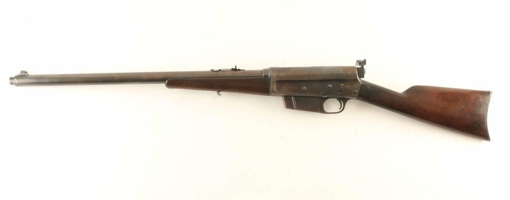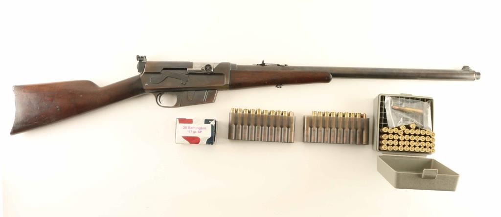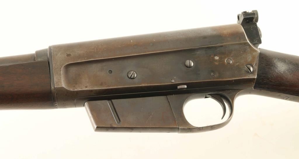 Semiautomatic rifle manufactured circa 1919. Features blued finish, wood forend & straight grip butt, semi crescent steel buttplate, 22" barrel, buckhorn style sights on barrel jacket, Redfield rear peep sight attached to receiver rear, fixed magazine, manual safety. Rifle can be taken down into two halves for storage or transport. Bore is fair condition, dark with strong rifling. Original blue is mostly a thinning brown or yellowish color, with patina forming at tang and some bare metal on sharp edges. Barrel jacket is straight, with no observed dents. Rear sight screws have badly marred slots, base and elevator slide are loose. Left side of receiver has several wide, shallow dents or hammer marks. Wood is good condition, dented & scratched, discolored in spots, with mostly good fit to metal. Includes approx 100 rounds (20 factory loaded, 80 reloaded in formed cases) of 25 Rem ammunition (plus 3 pieces of brass) in ammo can, plus a rare loader (stripper clip) for this rifle. Condition is NRA Good+ *** C&R Firearm ***
