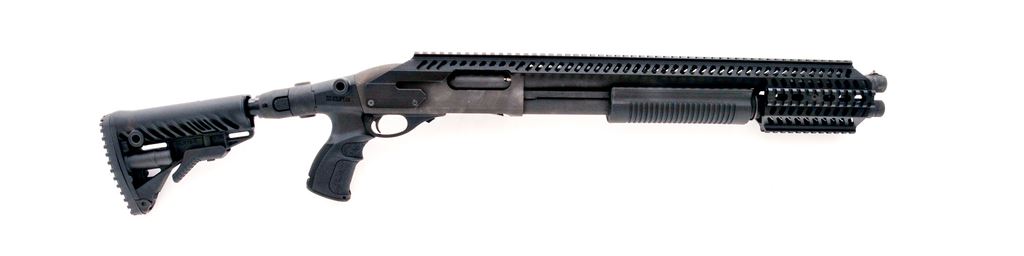 Tactical Remington Model 870 Pump Action Shotgun, #RS77707M, 12 ga., 3'' chamber, 18.5'' barrel, Cylinder bore, matte black finish, with silver bead front sight. Shotgun features a FAB Defense AGR-870 synthetic black recoil reduction stock with full pistol grip, and folding 4-position buttstock. Quad Picatinny rail which includes a full length upper rail and integral 6-round shell holder. Condition is excellent and appears near new. Matte surface shows some minor scuffs which are most noticeable around the muzzle. Stock and quad rail are as new showing a few insignificant handling marks. Excellent action and bore. Est.: $500-$800. (Modern)