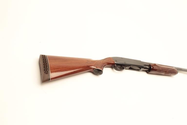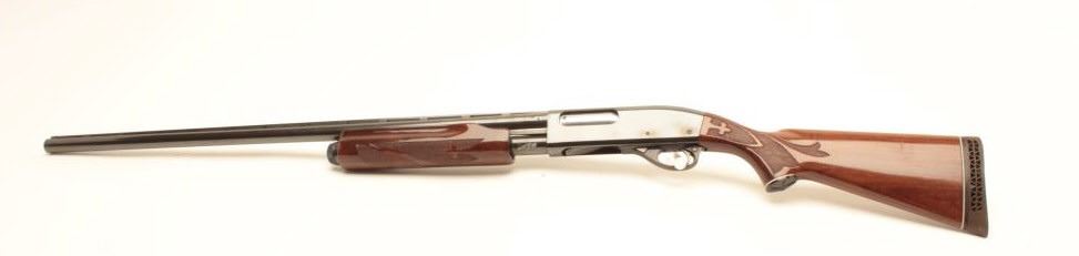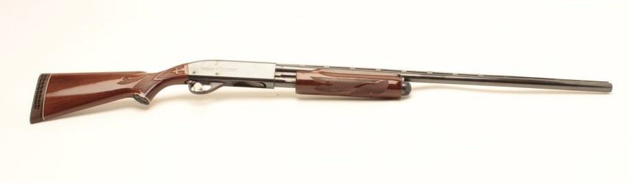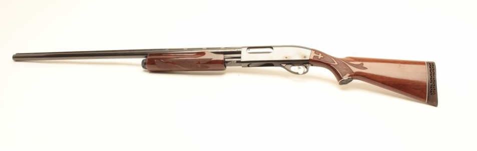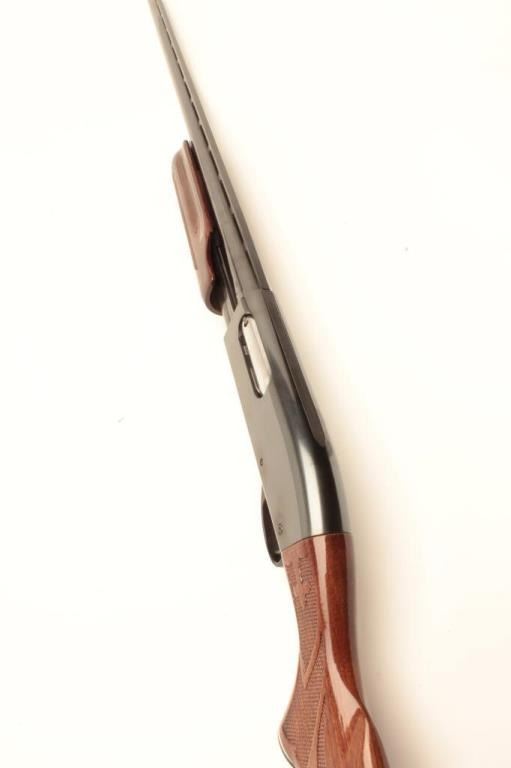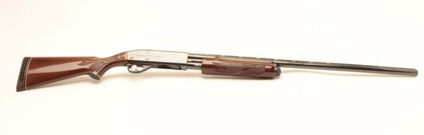 Remington Model 870LH (left hand) Wingmaster pump action shotgun, 12 gauge, 30” ventilated rib barrel, blued finish, checkered wood stocks, S/N V842858V, in overall fine condition with a fine bore, crisp action,fine wood. (Modern). Est.: $300-$600.