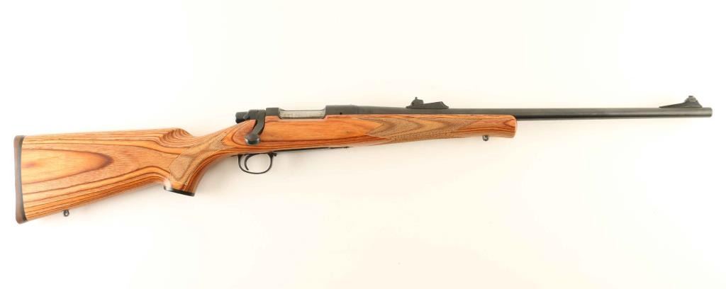 Bolt action rifle. 995 blued finish, with checkered, stripped wood stock. Black painted finish on the magazine plate, and triggerguard. 21" barrel, with adjustable rear sights. Bore appears excellent/bright, but a little dusty. Bolt locks up tight, smooth. Top of the receiver is drilled/tapped for scope rails. Wood is fine shape, except a small scratch/dent to the rear of the comb. Recoil pad, and sling swivel studs on stock. The front sight blade is dented, otherwise an almost new conditioned rifle. NRA Condition-very good, plus Modern Firearm.