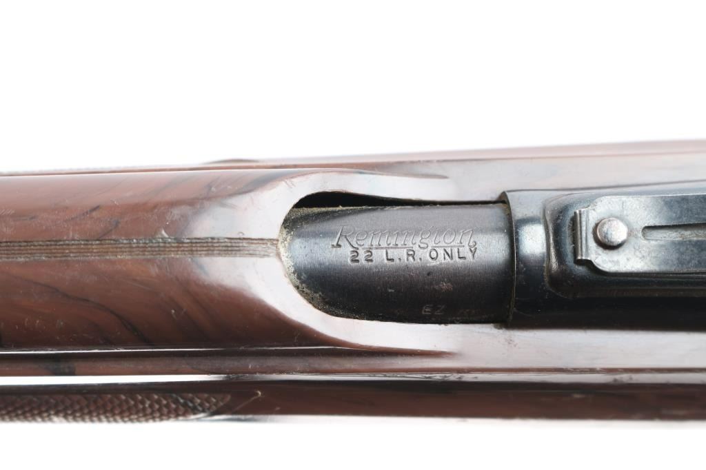Magazine fed semi-Automatic. "Mohawk" from the Remington 'Nylon' series. Produced 1971-1978. 'EZ' date code, Oct, 1975. Blued finish, brown polymer stock with white diamond, factory buttplate and grip cap. 19.5" barrel with adjustable rear sight, large blade front sight. Receiver grooved for scope mount. Fed from a 10 rd box magazine, (Included). Bore is excellent/bright, action is smooth, stock is overall good/sound with scratches/scuffs and the blue is about 70% with edge wear, scratches, wear on the upper barrel and some scattered patina. Comes with a spare 5-rd magazine.