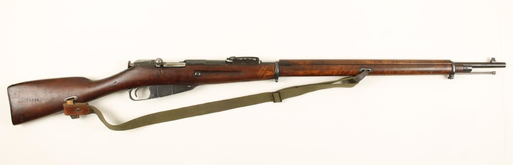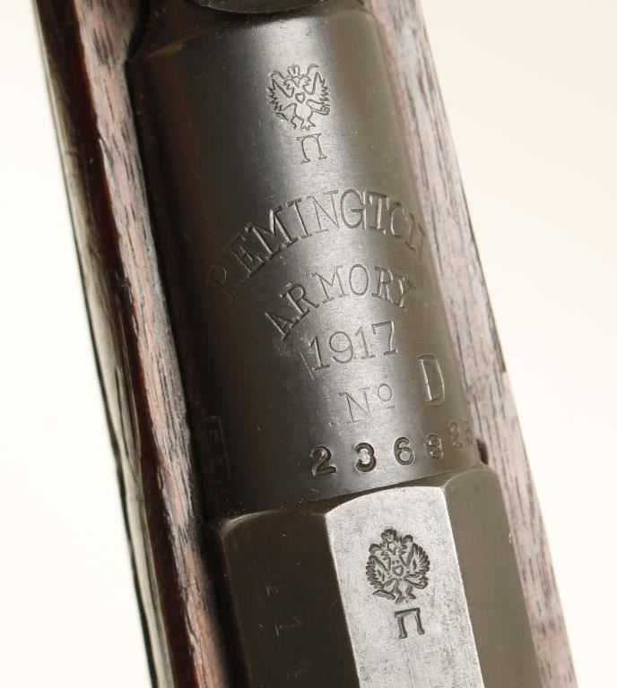 91/30 US made for Imperial Russia in 1917. Blued bolt-action rifle with a 31-1/2" barrel and a web/leather sling. Import marked. Retains Imperial crests. All serial numbers do not match. Metal finish is good with edge wear and a few scratches. Butt plate is worn to bare metal with surface rust. Wood has a round cartouche and a serial number stamped on it. This stock has a finger joint behind the barrel band where the 2 pieces of the forend are united. There are dings, dents, scrapes, rubs and scratches. Bore is frosty with lots of rifling. Action works well. Condition is fair. *Modern Firearm*
