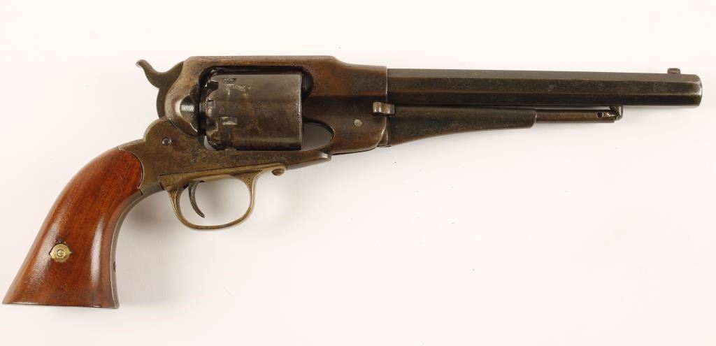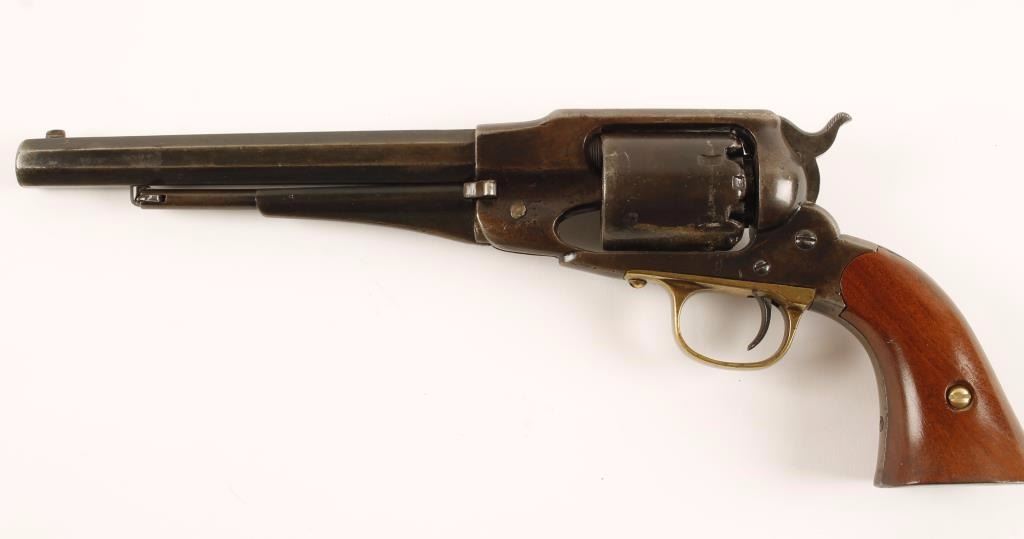 Refinished Civil War period U.S. Army percussion revolver chambered in .44 caliber, circa 1860's - 1870's. Features a clear coat over a blued finish, screw in front sight, notched rear sight, loading lever, non-fluted six shot cylinder with safety notches, checkered low hammer spur, smooth trigger, brass trigger guard and replacement two piece walnut grips. Finish is peculiar and shows losses and light surface rust on barrel. Barrel address is light but legible and serial number is very faint and we made our best determination to identify it, but it may not be accurate. Revolver shows inspector marks on loading lever, frame, trigger guard, barrel and cylinder. Action functions well, nipples are all good, bore is clear and wood grips are extra fine. Condition is good. ***Antique Firearm***