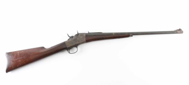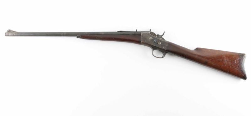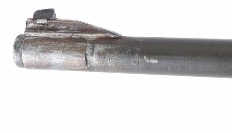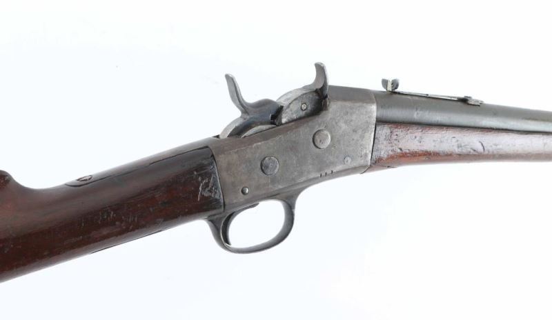 Rifle. Rolling-Block Action. Carbine configuration. 22" barrel with front triangle, and v-notch rear sights. Has been re-barreled with a U.S. .30 cal. barrel stamped R A 4-44, with flaming ordnance bomb. Bore appears good, but dirty. Action is stiff. Barrel has wartime parkerized finish. Receiver has turned a dull gray patina, with rust spots. There is rust on the block. There are 3 notches cut into both sides of the receiver. Wood has scratches/dings, and has been varnished. Steel schnabel forearm cap. Chip repair on lower forearm. Crescent steel buttplate. "385" stamped on lower tang. NRA Condition-Fair. Antique Firearm.