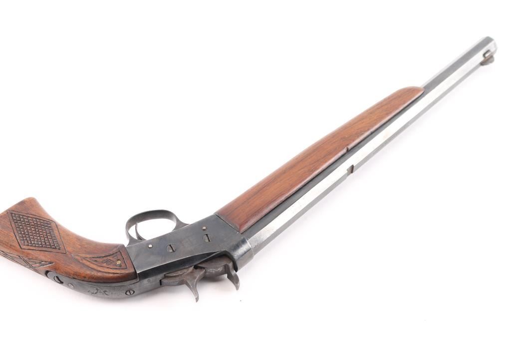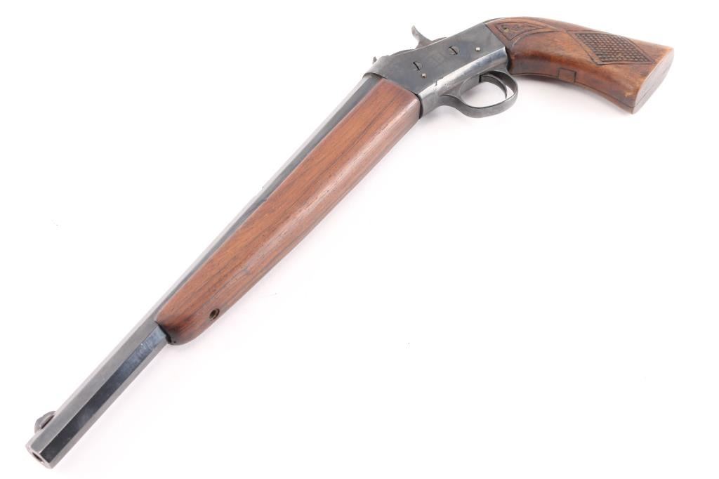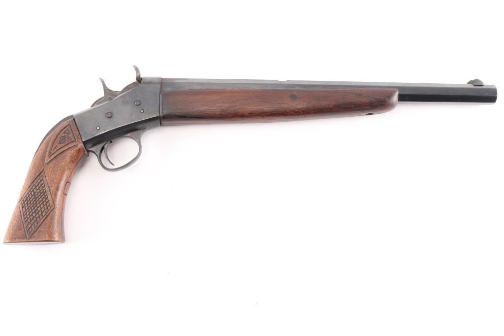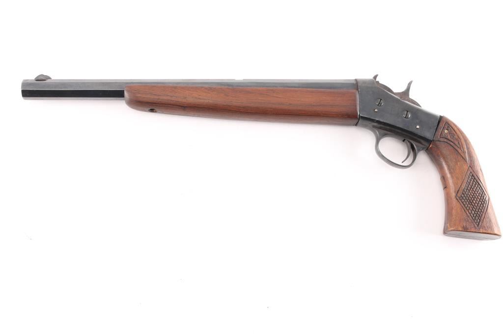 This is a Remington No. 4 rolling block currently in a custom pistol configuration. It is Approximately .32 caliber center-fire. The barrel has the Remington Arms Co. Ilion N.Y. address and non take-down frame. The octagonal barrel measures 12 1/4" with a dovetailed blade front sight and vacant rear sight dovetail. The tang has been bent to form the backstrap of the grip which has a loosely checkered wood grip handle (grip has a crack in it). The bore is rough, with pitting and little to no rifling detected. The block can be actuated with the hammer held beyond full cock. Has been reblued with light pitting on the receiver showing under it.