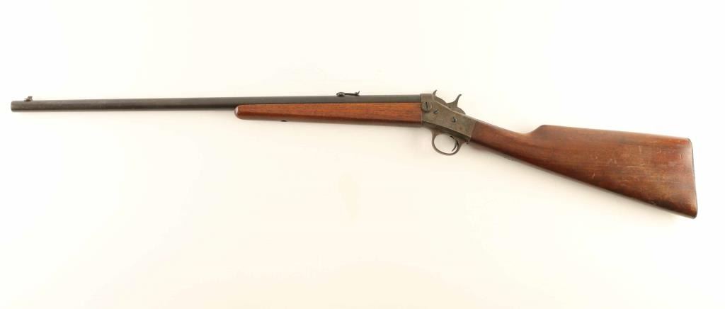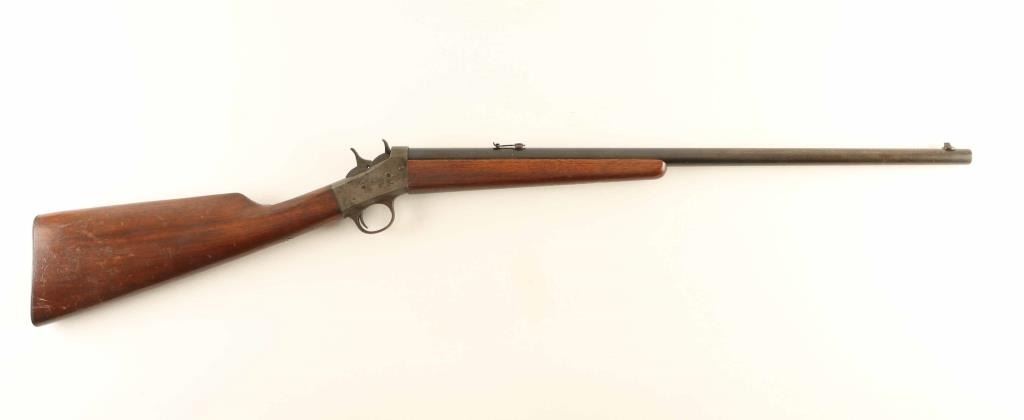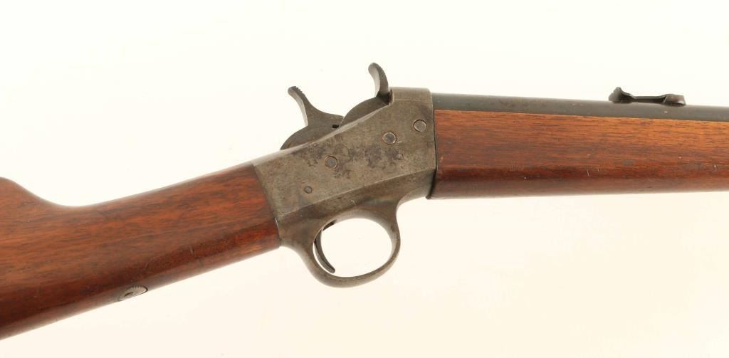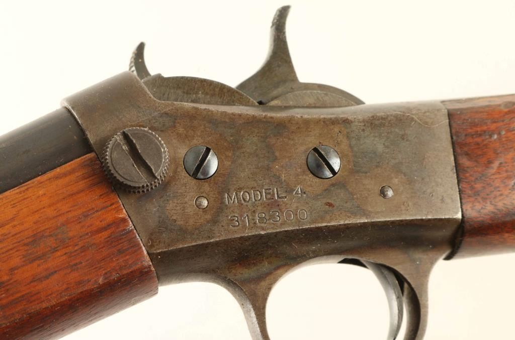 SN: 318300 Single shot rimfire rifle features 22" barrel, adjustable buckhorn style sights, exposed hammer, flat metal buttplate. Bore is good condition, frosted, with sharp edges rifling. Barrel retains 60% blue, turning brown, with large area of thin brown with scratches near muzzle. Case color receiver has dulled and faded, aged patina showing heavily on right and at tang, scattered light patina on left side. Wood is good condition, with scrapes and dents. Markings on barrel and left side of receiver are crisp. Condition is NRA Good ++ *** C&R Firearm ***
