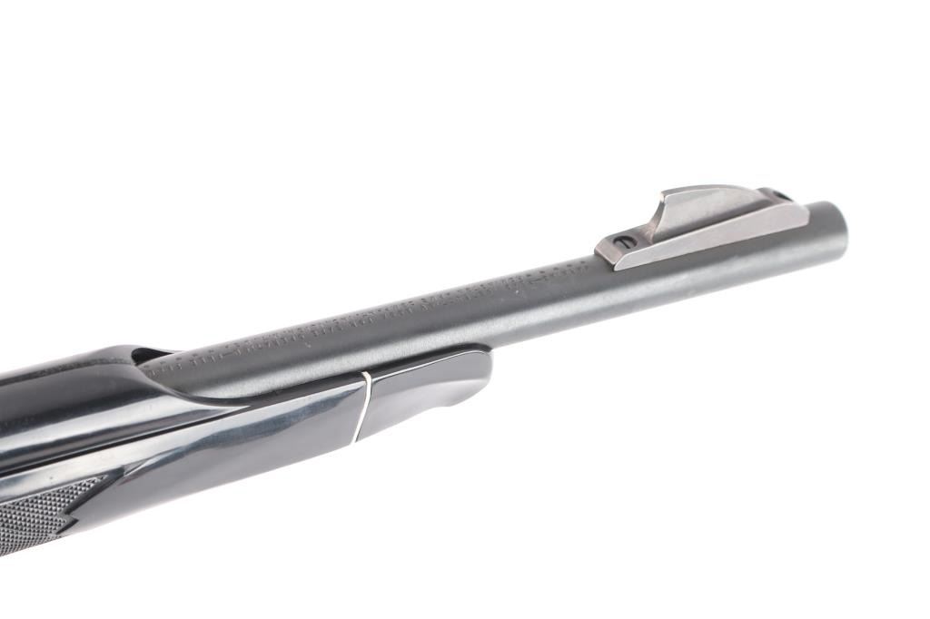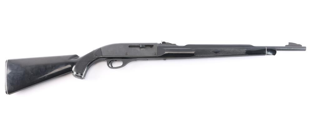 The 'Black Diamond' Semiautomatic rimfire rifle. Manufactured 1986. Features blued finish, black polymer stock, 19.5" barrel, large blade front sight, adjustable rear sights, manual tang safety, tube magazine in butt, grooved trigger, plastic trigger guard and integral scope base machined into receiver. Bore looks excellent/bright. Metal finish has a couple of minor scratches/rubs, polymer stock is excellent.