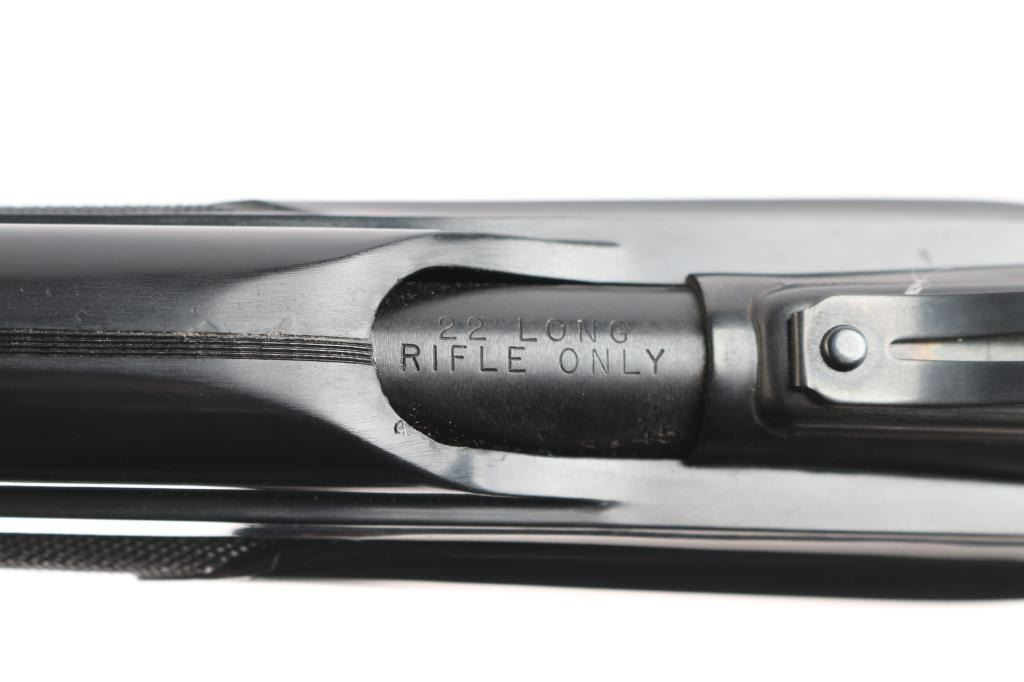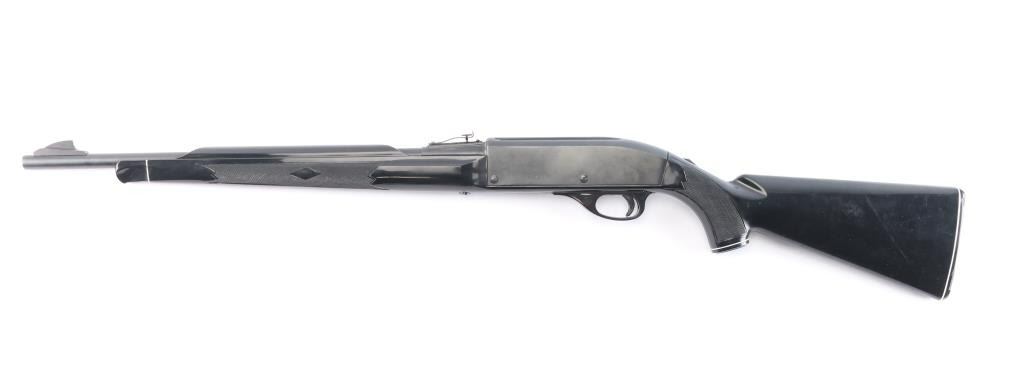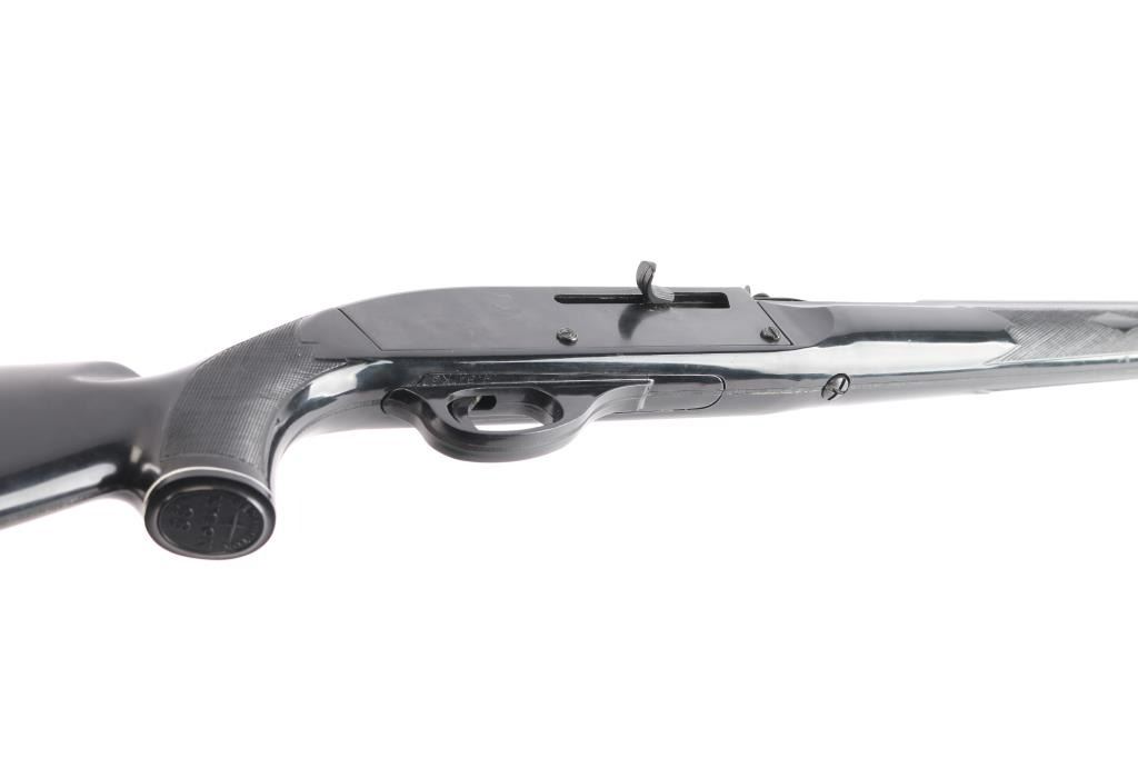 The 'Black Diamond' Semiautomatic rimfire rifle. Manufactured 1986. Features blued finish, black polymer stock, 19.5" barrel, large blade front sight, adjustable rear sights, manual tang safety, tube magazine in butt, grooved trigger, plastic trigger guard and integral scope base machined into receiver. Bore looks excellent/bright. Metal finish has a couple of minor scratches/rubs, polymer stock is excellent.