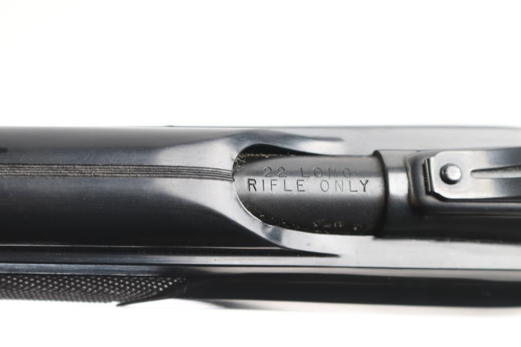 The 'Black Diamond' Semiautomatic rimfire rifle. Features blued finish, black polymer stock, 19.5" barrel, large blade front sight, adjustable rear sights, manual tang safety, tube magazine in butt, grooved trigger, plastic trigger guard and integral scope base machined into receiver. Bore looks excellent/bright. Metal finish has a couple of minor scratches, polymer stock is excellent.