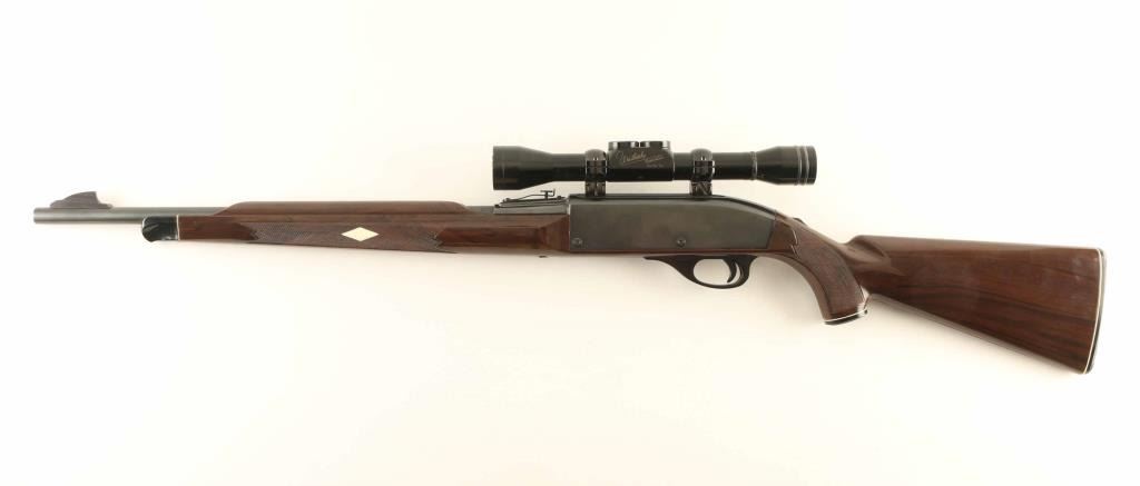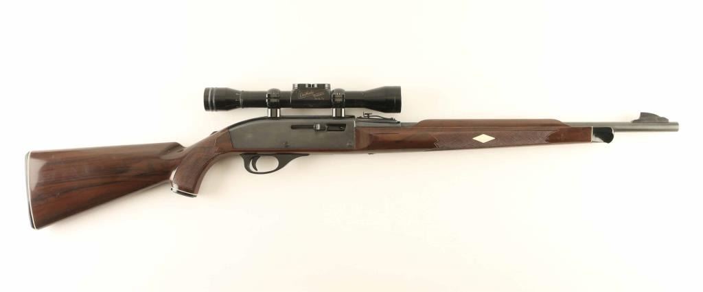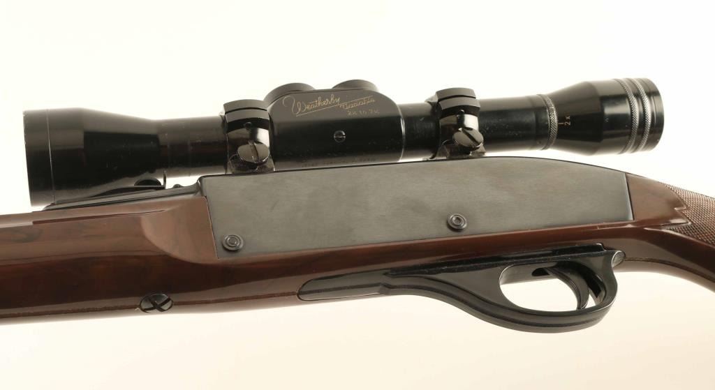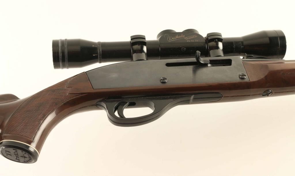 Semiautomatic rimfire rifle features blued finish, brown polymer stock, 19.5" barrel, adjustable sights, manual safety, tube magazine in butt, scope mounted to receiver dovetail. Bore is very good condition. Retains 90% blue with some scratches and rub marks. Stock is in excellent condition with few scratches. Mounts a fair condition Weatherby Variable 2-7x scope, with fine crosshair & dot reticle, clear view, crosshair almost disappears at lower magnification settings. Condition is NRA Very Good ++ *** C&R Firearm ***