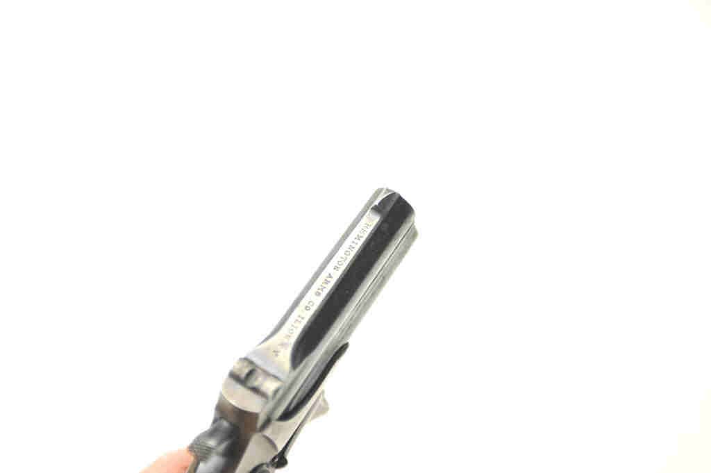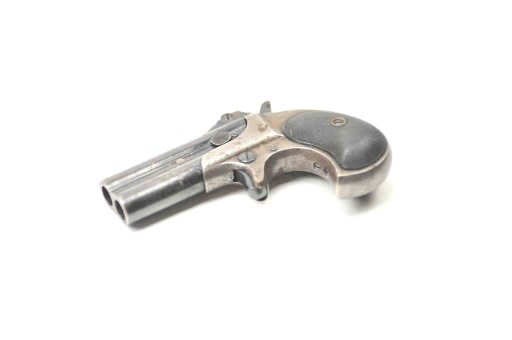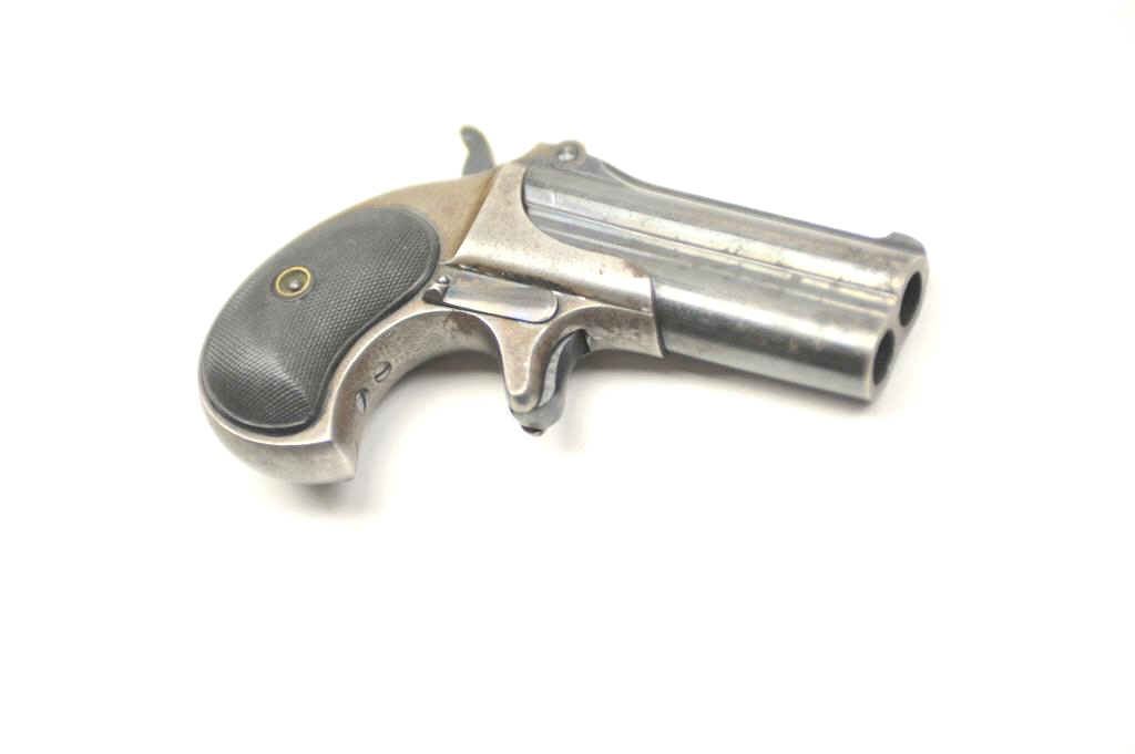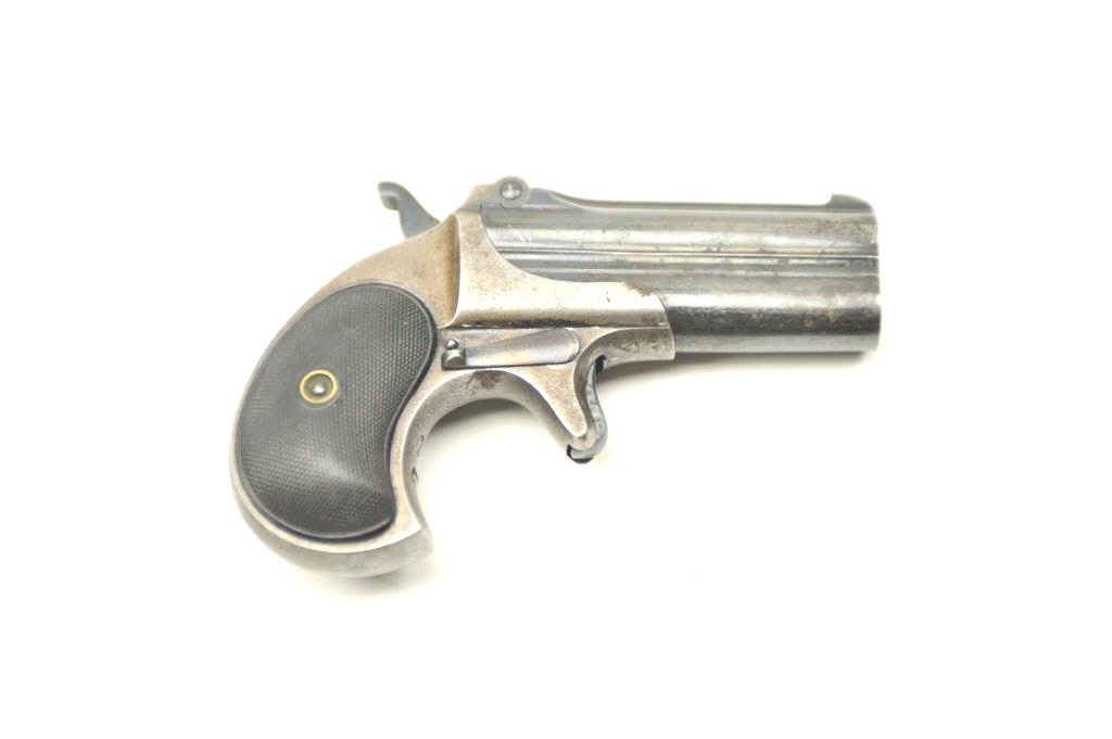 Remington Over/Under derringer, .41 caliber, Serial #522. The pistol is in nearly fine overall condition with considerable original blue on the barrels and a clear, crisp barrel address. The checkered hard rubber gripsare very good condition. The bores are good, the action works well and the markings are sharp. Est.: $350-$700. (Antique).
