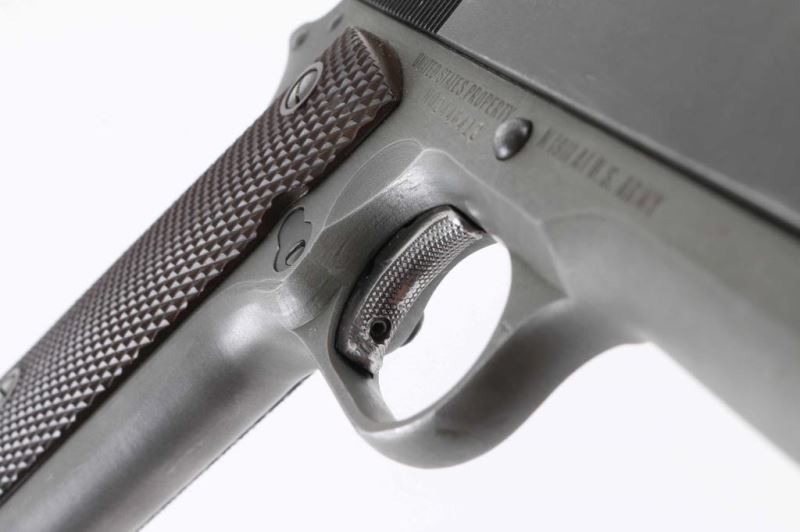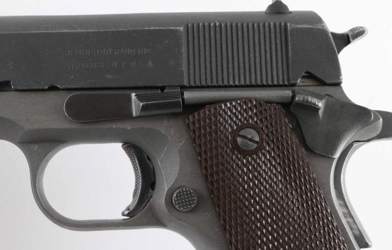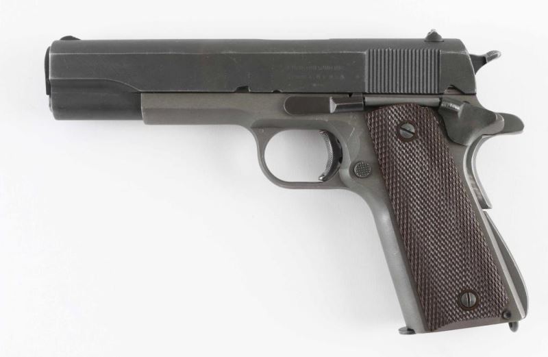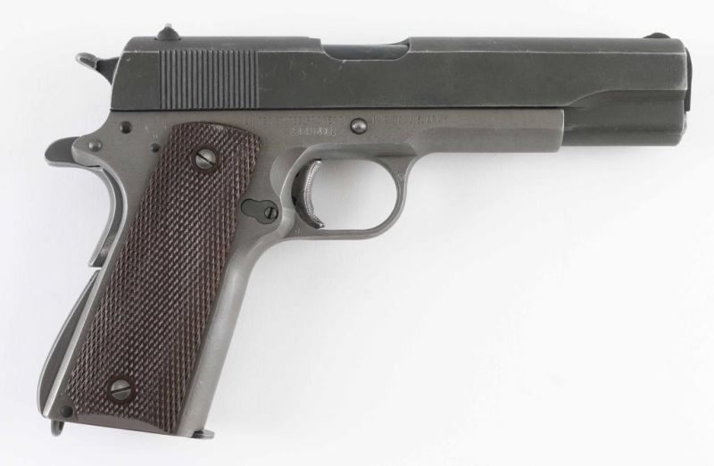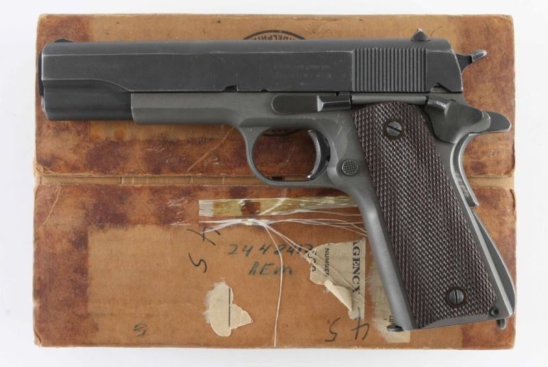 SN: 2448412 Pistol. Semi-Automatic. U.S. Military pistol manufactured the last year of WW2 in 1945. Magazine fed, short recoil. 5" Barrel. Slide mounted front blade and U-notch rear sights. Parkerized "Wartime" metal finish, two-tone. Grip safety. Lanyard ring. Trigger travel stop. Wide M1911 hammer. Right frame stamped , to the rear of the slide stop pin is "United States Property" with the serial number below it. "M1911A1 U.S. Army" is stamped to the front of pin. Feint Ordnance stamp behind the grip panel. "G" is stamped under the firing pin stop on the slide. Left side of frame is stamped in 2 lines "Remington Rand Inc. Syracuse,New York." "P" is stamped in front of the rear sight, and below the magazine release button. Barrel stamped "F", and "P". No serial number on slide. Right triggerguard is stamped "J", and "Y". "FJA" inspectors stamp is present below the slide catch. (Col. Frank J. Atwood)) Brown checkered plastic are reinforced , and appear original to the pistol. Bore is excellent/bright. Slide action is smooth/tight. Metal finish is about 97% with minor edge wear, and some minor scratches. . Comes with original unmarked magazine. Also included is its original Remington Rand Shipping box, with two extra magazines, and Trigger. NRA Condition- Very Good. C&R Firearm. Sn: 2448412