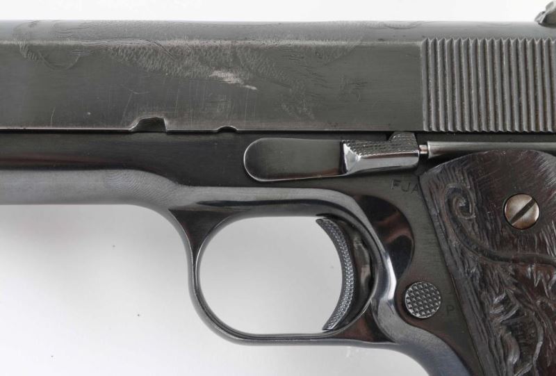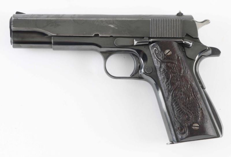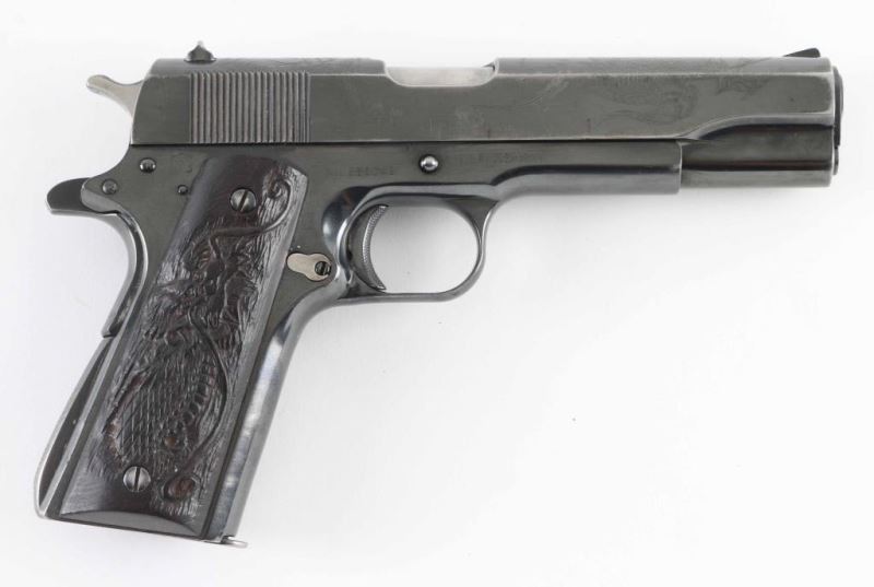 SN: 986049 WWII era US Military semiautomatic pistol features re-blued finish, custom wood grips with carved dragons, 5" barrel, fixed sights, single action trigger, grip safety, manual safety, knurled arched mainspring housing. Bore is very good. Retains 90% high polish re-finish with bare metal on sharp edges and on left side of slide. Grips are very good condition. Markings on frame are thin and partially eroded, slide is unmarked. Features shallow dragon images that appear etched, covering much of slide. Includes (1) magazine. Condition is NRA Very Good (refinished) *** C&R Firearm ***