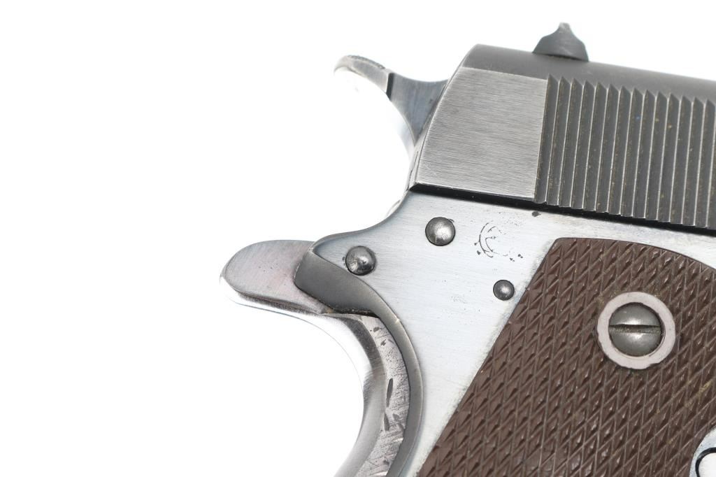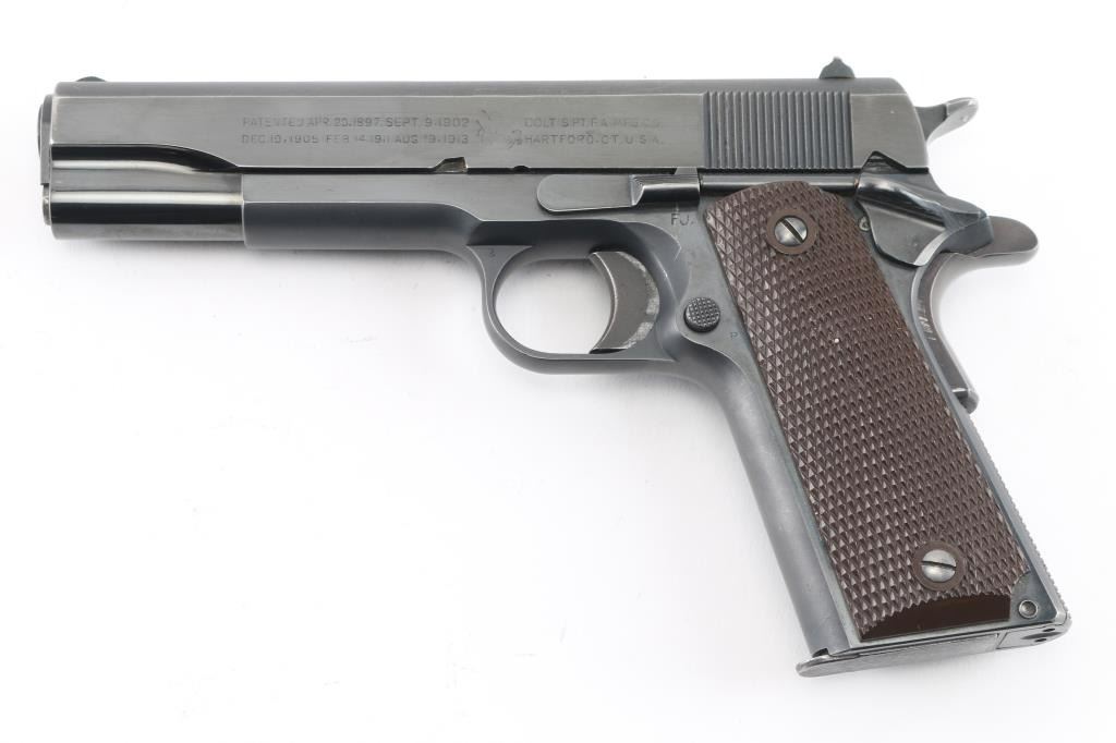 SN: 1989687 U.S Military WWII era semiautomatic pistol manufactured circa 1944. Colt commercially marked slide & commercial barrel. Refinished. Features blued finish, reinforced checkered brown plastic grips, 5" blued barrel, fixed front & dovetailed rear sights, single action, smooth faced trigger, grip safety, manual safety, checkered flat mainspring housing (lanyard loop removed). Bore is very good. Retains over 90% finish, with edge losses, scratches, discolored areas on sides of slide. Slide retains good contours, frame shows some loss of original contours at edges from heavy buffing. Markings are a bit eroded throughout, Rampant Colt on slide is visible. Grips are very good. Markings include: Colt address on left side of slide, "UNITED STATES PROPERTY", M1911A1 US ARMY", faint "P" behind mag button, "FJA" below slide stop ("A" is very faint), "2" and "E" on trigger guard. Faint partial crossed cannons on right frame. Includes (1) very good condition blued steel magazine, electric pencilled "U49017". Condition is NRA Very Good (refinished) *** C&R Firearm ***