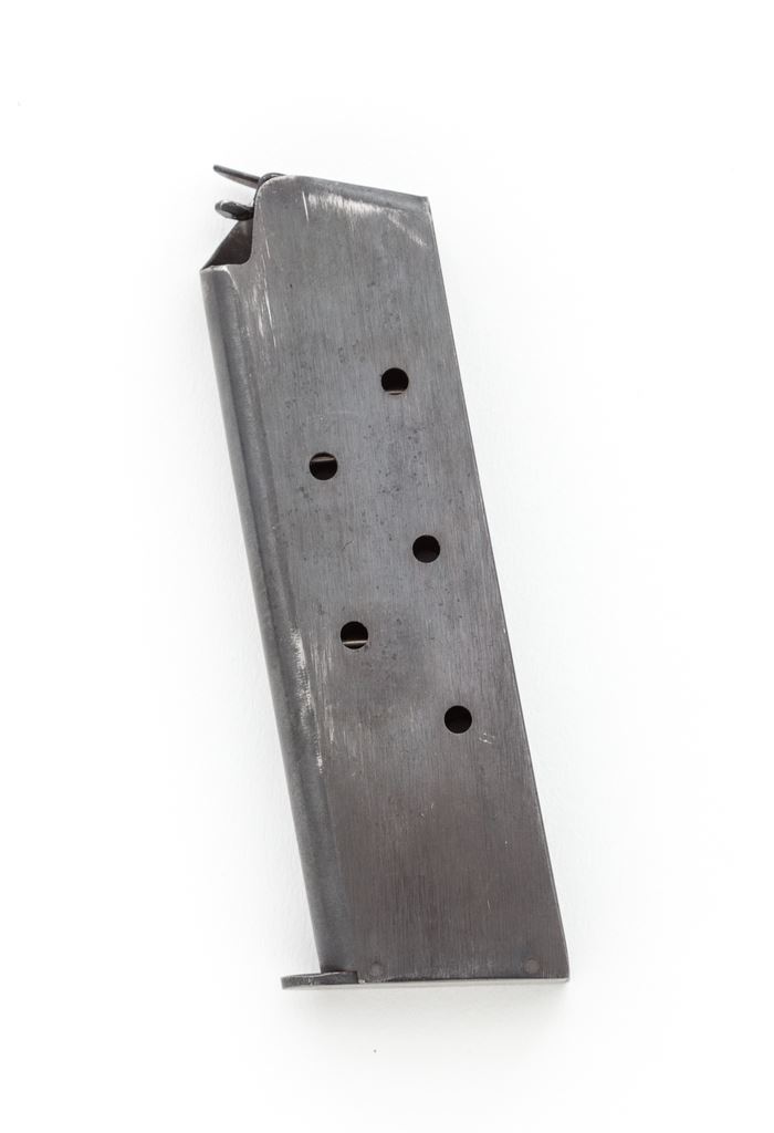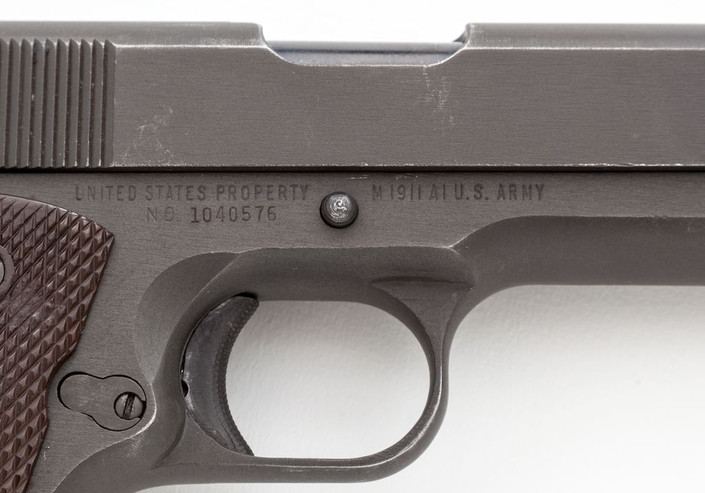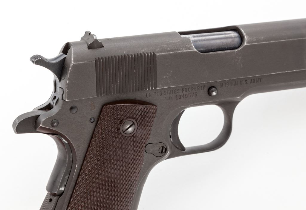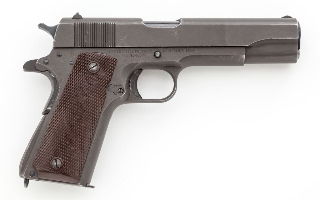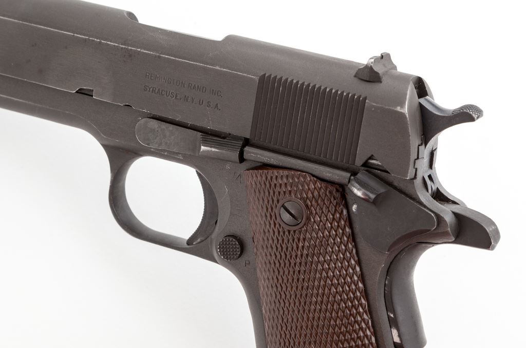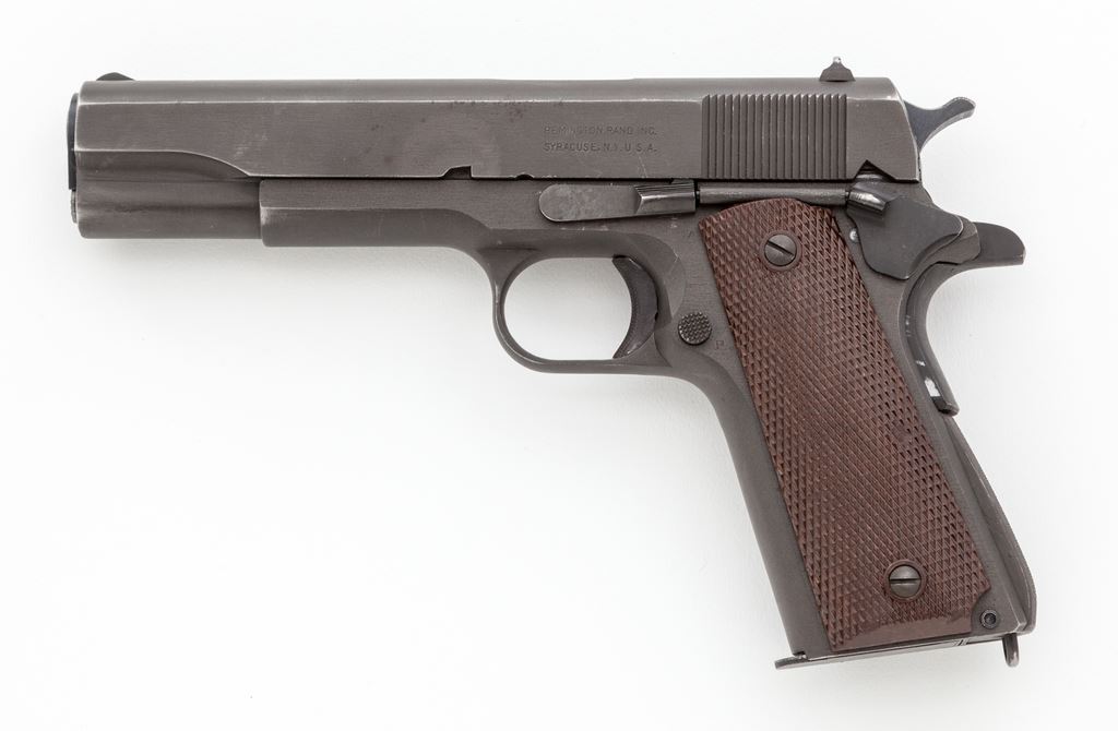 Remington-Rand Model 1911-A1 Semi-Automatic Pistol, #1040576, .45 ACP cal., 5'' barrel, parkerized finish, brown checkered plastic grips with small reinforcing rings, and two (2) blue WWII contract magazines. Mfg'd 1943. Condition is excellent as possibly arsenal refinished, as the Ordnance wheel is not stamped thru the finish. WWII era Colt barrel with excellent bore is lightly electro-penciled ''X160391AZ'' and cannot be seen when gun is assembled. Grips show light wear. Action is crisp. Est.: $1,000-$1,500. (C&R/PPT)