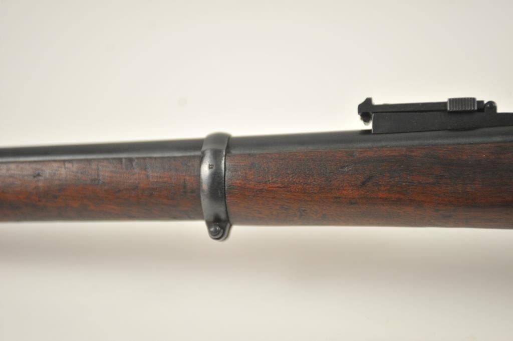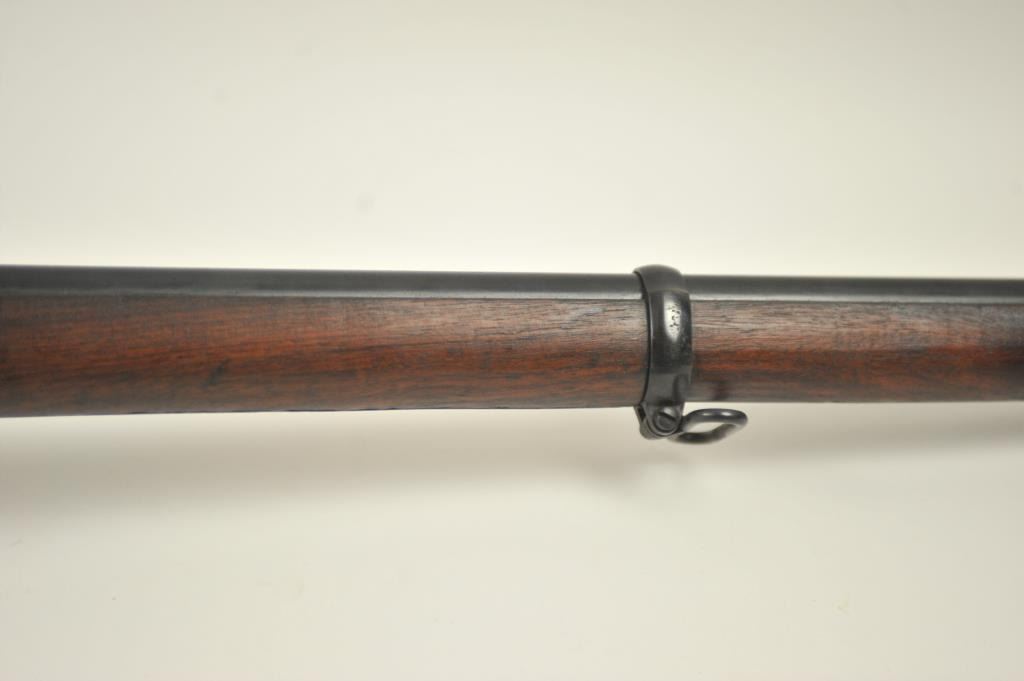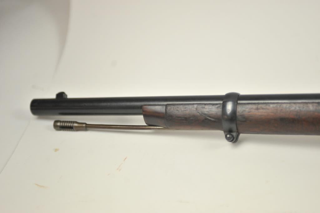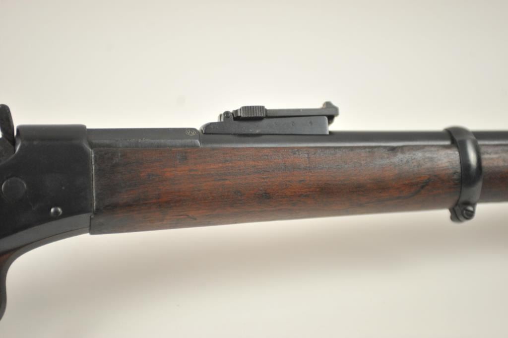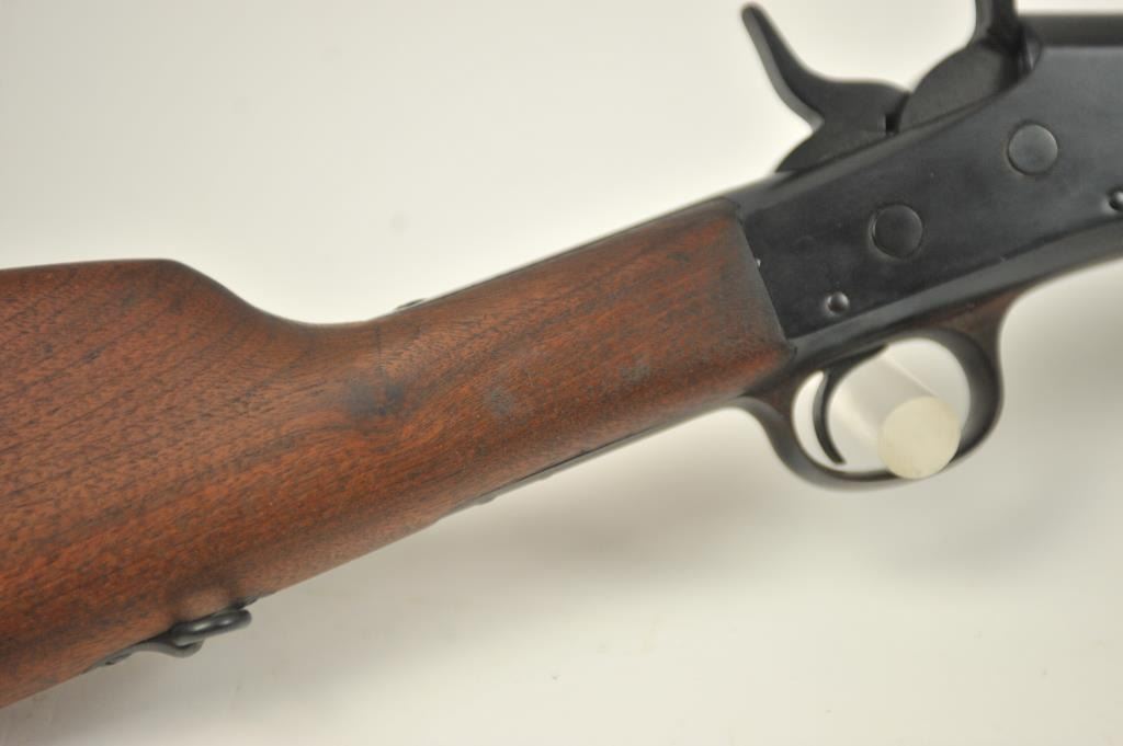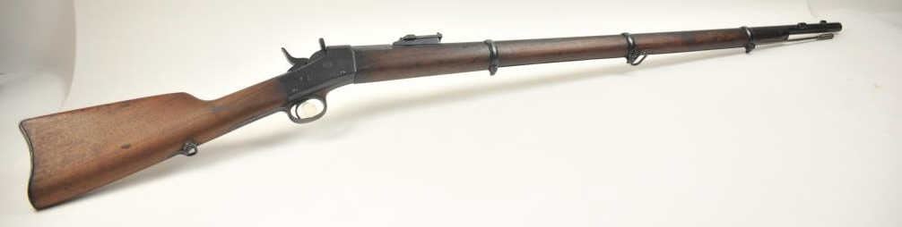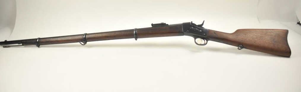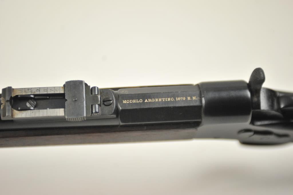 Remington Rolling Block military rifle marked, “Argentino 1879” on the breech in 11mm Mannlicher caliber. The rifle is 90-95% arsenal dark blue finish with very good stocks. The bore is excellent showing little firing or use. The rod is included with a stud for a saber bayonet. The action is tight. Est.: $300-$600. (Antique).