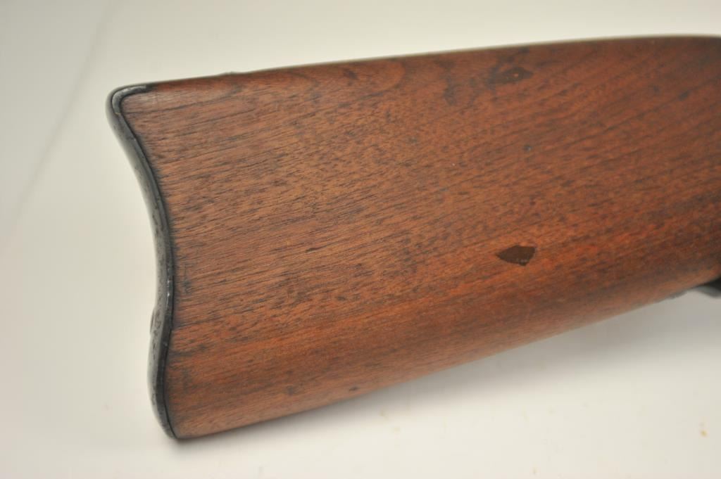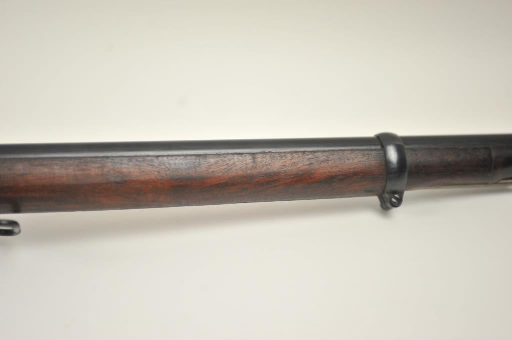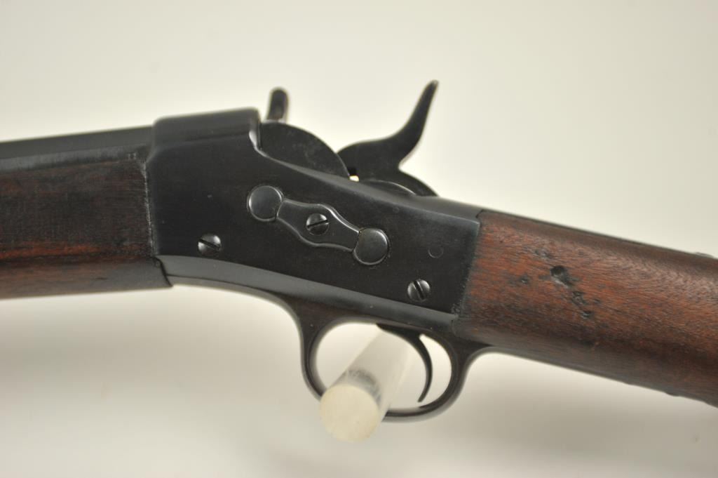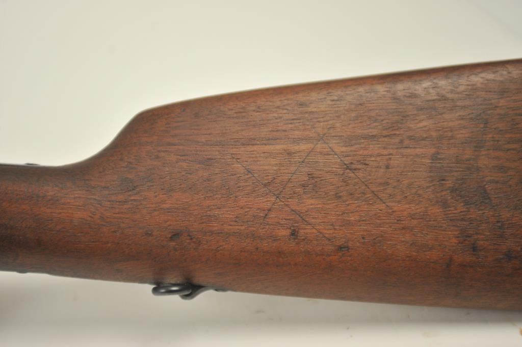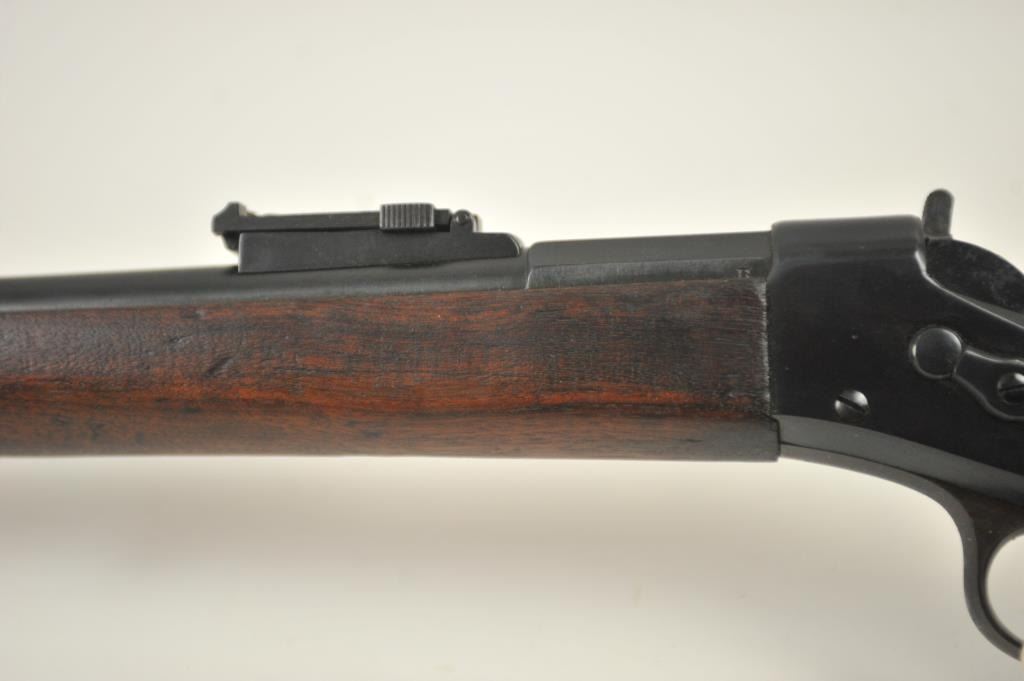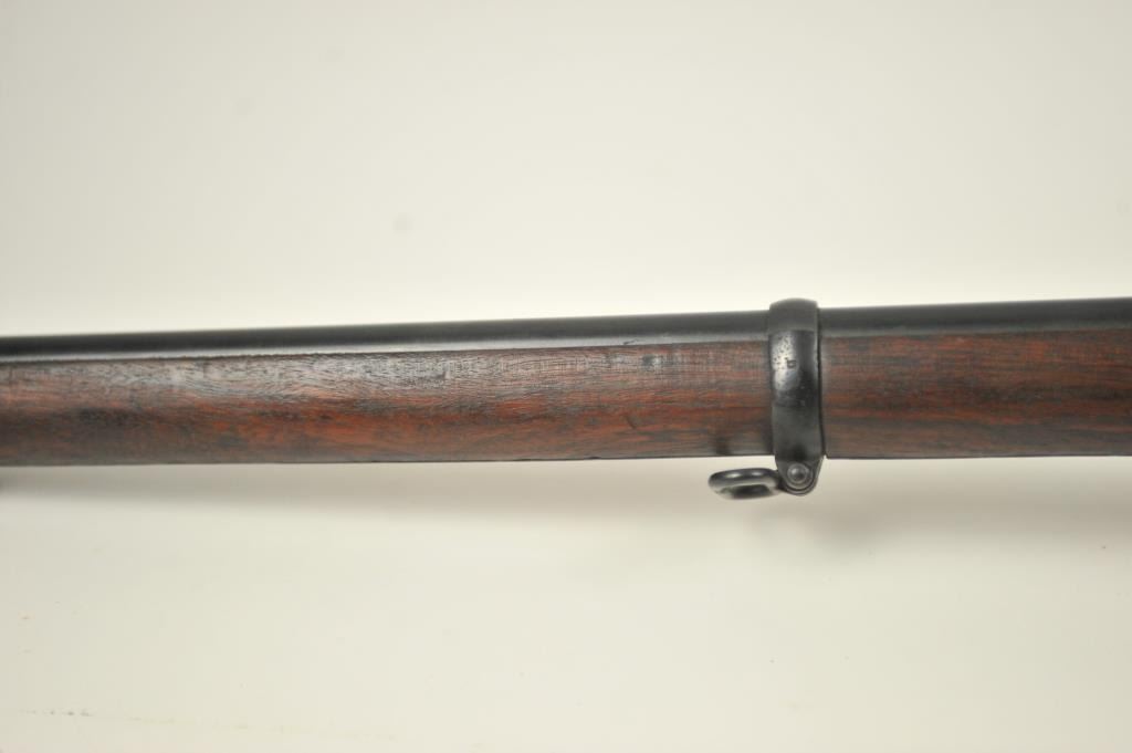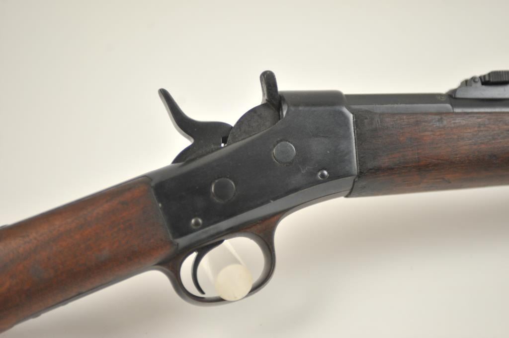 Remington Rolling Block military rifle marked, “Argentino 1879” on the breech in 11mm Mannlicher caliber. The rifle is 90-95% arsenal dark blue finish with very good stocks. The bore is excellent showing little firing or use. The rod is included with a stud for a saber bayonet. The action is tight. Est.: $300-$600. (Antique).