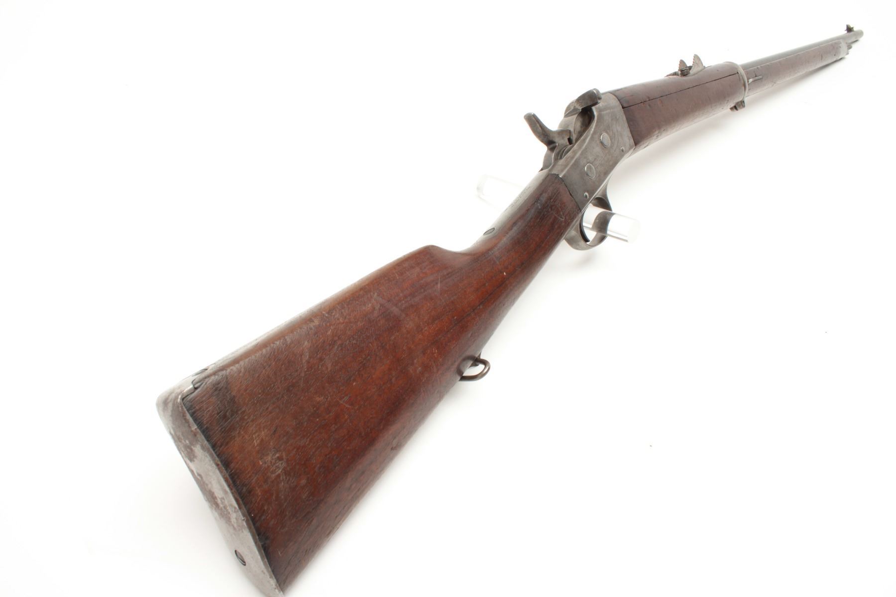 Remington Rolling block rifle, 7mm caliber, 30” barrel, wood stocks, no visible S/N, in overall good condition traces of blue on barrel and silver tone to receiver; good wood. (Antique). Est.: $300-$600.