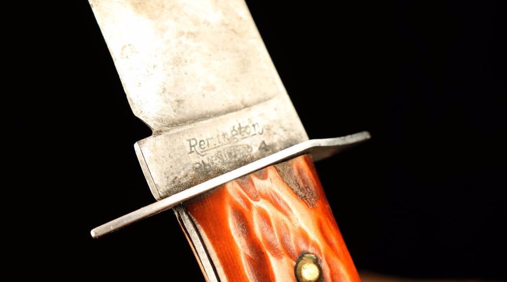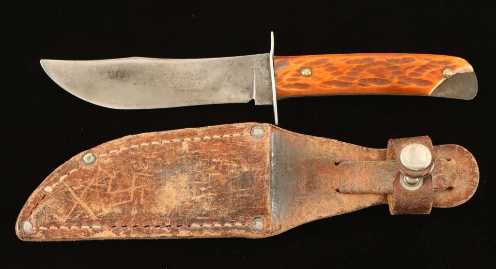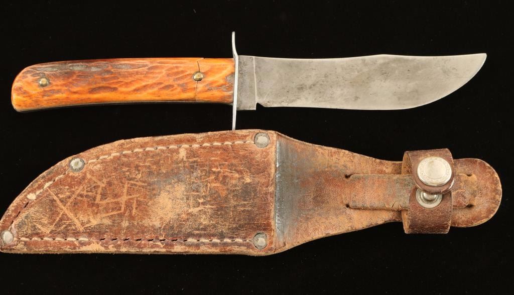 With faux antler handle. Measures 7 1/2" overall with 3 1/2" blade. Grip is chipped on one end and cracked on opposing side. Blade shows heavy use. Includes leather sheath.
