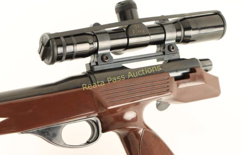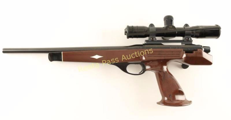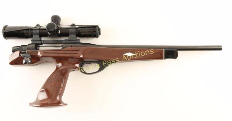 Single-shot bolt action pistol chambered in .223 Remington, circa 1986-1994. Features a blued finish, 15" barrel with no provisions for sights, Burris 3x scope on Talley rings, serrated trigger, removed safety, bent bolt handle, drilled & tapped receiver for side mount sights and faux wood nylon stock. Pistol exhibits approximately 97% of it's original blued finish showing light muzzle wear and a few minor handling marks/scratches. Action is smooth, bore is pristine, optics are clear and nylon is near fine showing some light scuffs/scratches. Condition is excellent. ***Modern Firearm***