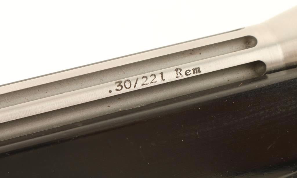 Customized single-shot bolt action pistol chambered in .30/221 Remington, circa 1963-1985. Features a satin silver finished receiver, fluted WF Custom 15" stainless steel barrel, globe front sight, Bo-Mar adjustable rear window sight, custom trigger, removed safety, fluted bolt, skeletonized bolt handle, and black wood stock with a 1996 NRA NATIONAL SILHOUETTE CHAMPIONSHIPS sticker. Pistol exhibits muzzle wear, minor handling marks, some light surface rust on the rear sight and a single small spot of dark rust on the receiver. Action is smooth, bore is pristine and wood stock is very good. Condition is very good++. ***Modern Firearm***