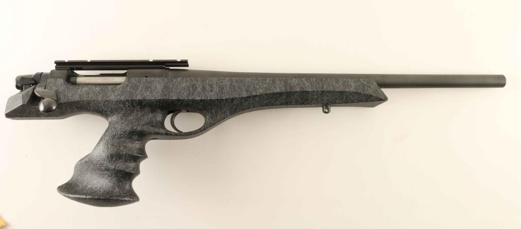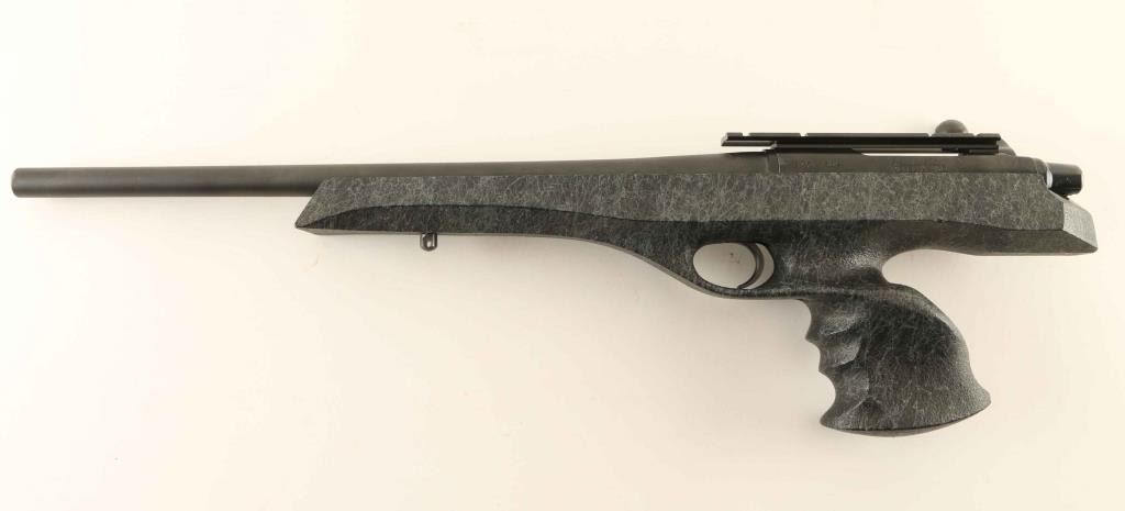 Customized single-shot bolt action pistol. Features a matte black finished 17" factory barrel that has been rechambered for 6.5 Creedmoor, no provision for sights, blued receiver with installed optics rail, serrated trigger, manual safety, and contoured stock with target style grip & front swivel stud. Pistol retains approximately 97% of it's finish showing minor wear and a small amount of light rust on the barrel near the muzzle. Action is smooth, the bore is excellent and the custom stock is very good. Condition is near NRA Very Good++. ***Modern Firearm***