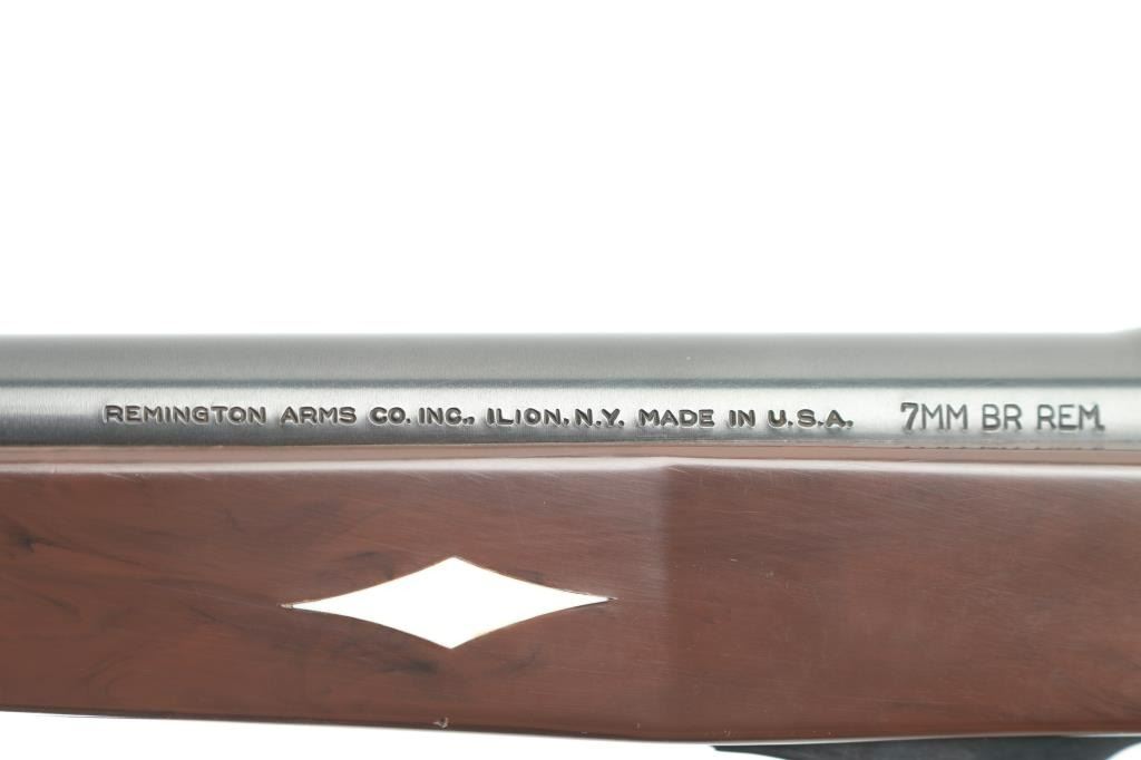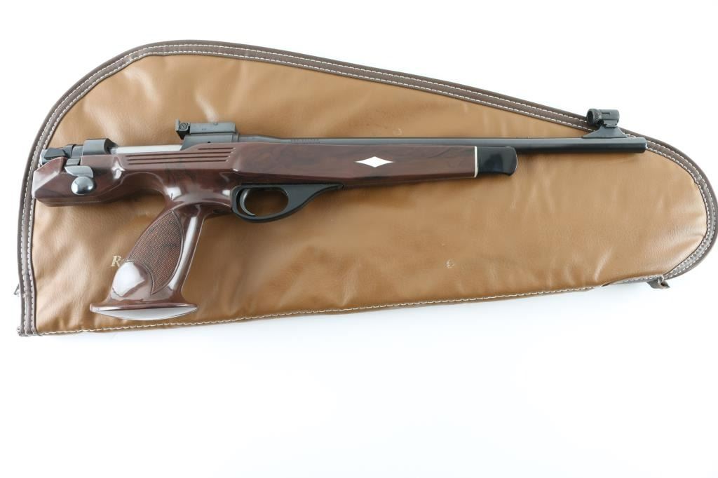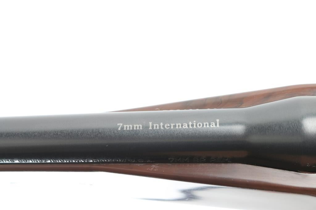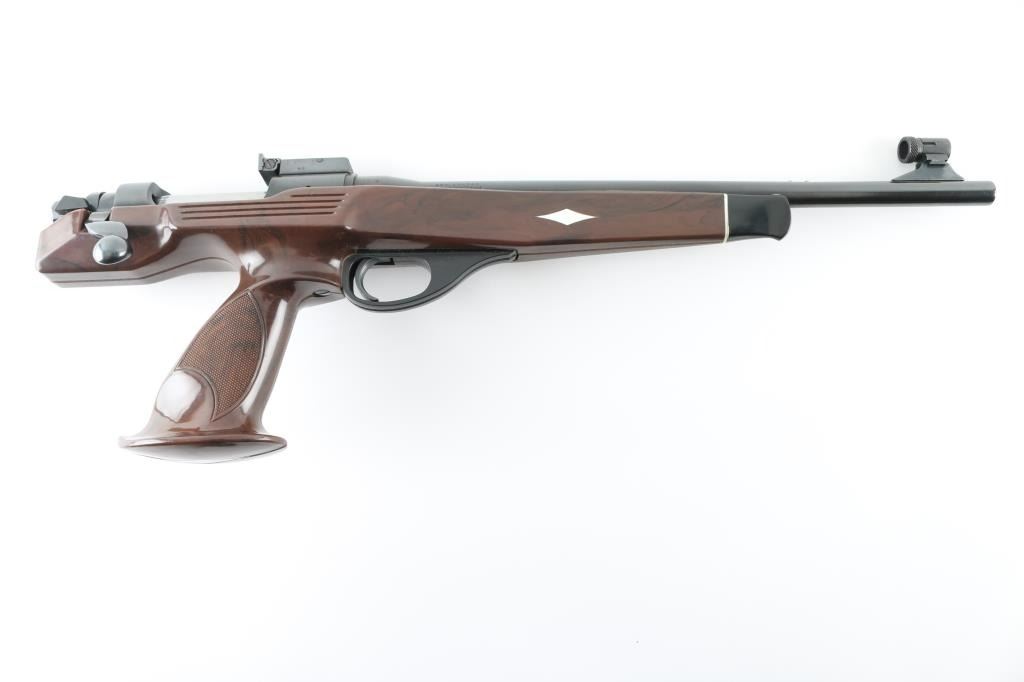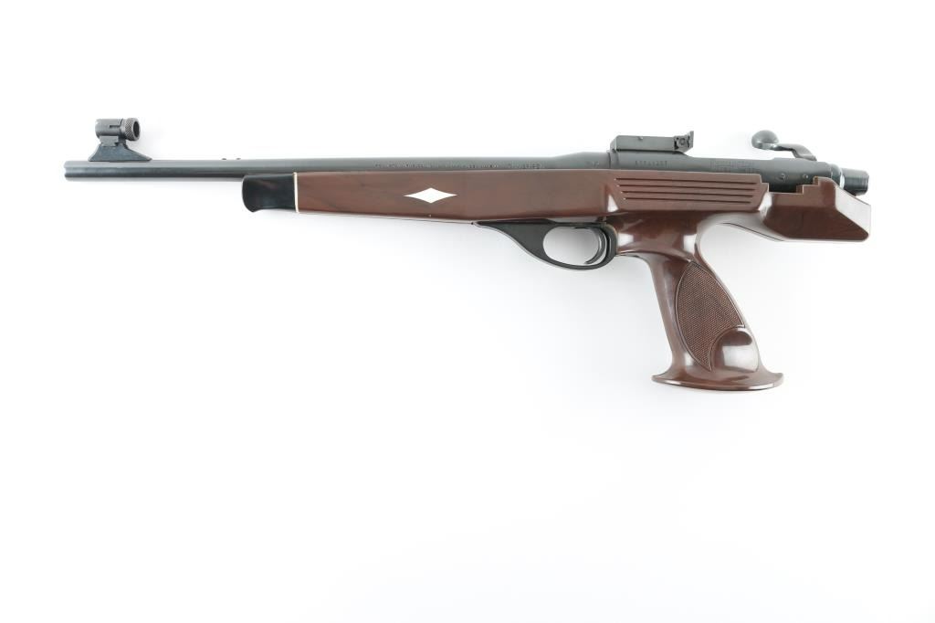'7mm International' Single-shot bolt action pistol. Barrel date 1980. Features a blued finish, 14.5" barrel, globe front sight with post, Bo-Mar adjustable rear sight, serrated trigger, manual safety, dog leg bolt handle, brown nylon stock with checkered pistol grip. Pistol exhibits approximately 98% of it's blued finish showing little to no visible wear. Action is smooth, bore is pristine and nylon is near fine showing some light scuffs/scratches. Includes Remington XP-100 labeled pistol rug. Condition is NRA Excellent *** Modern Firearm ***