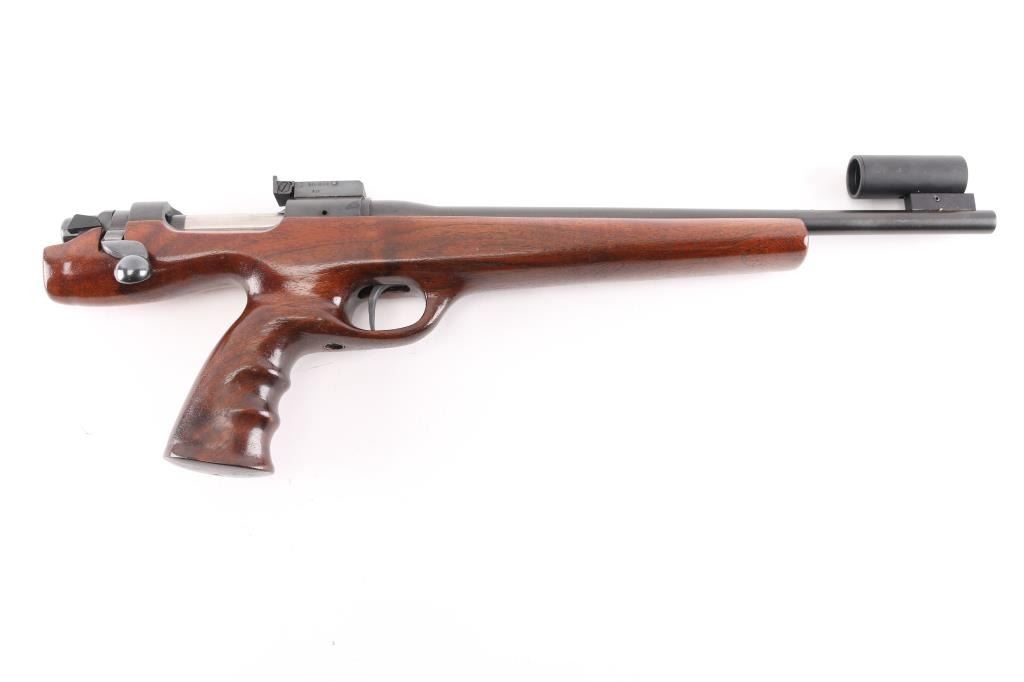Customized single-shot bolt action target pistol chambered in 7mm BR Rem., manufactured circa 1963-1985. Features a blued finish, 15" tapered barrel with Bond globe front sight with adjustable post, Bo-Mar micro adjustable square-notch rear sight. , serrated trigger, bolt release on the right side of the receiver, blued bolt with bent handle, and custom select walnut finger-grooved pistol grip stock. No safety. Pistol retains approximately 97% bluing slowing some minor scratches and muzzle wear. Action is smooth, the bore is excellent and wood stock is excellent.