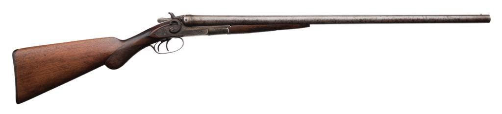 Remington exposed hammers SxS shotgun, 12 gauge, 27.5” damascus barrels, S/N 227055, checkered wood stocks. This shotgun is in overall good to very good condition displaying a brown patina on the barrels with some scattered spots of erosion and a mixture of original case colors and silvery tones on the receiver. The actions are crisp, the markings good and the bore is dirty but may clean to good +. The wood butt stock is evenly worn and very good overall with the correct hard rubber butt plate. The forend shows an old ill-fitted repair to the back end of that part. Est.: $300-$500.