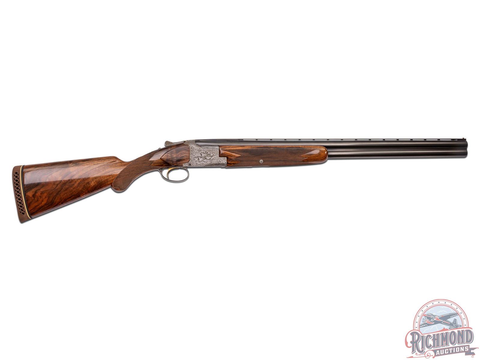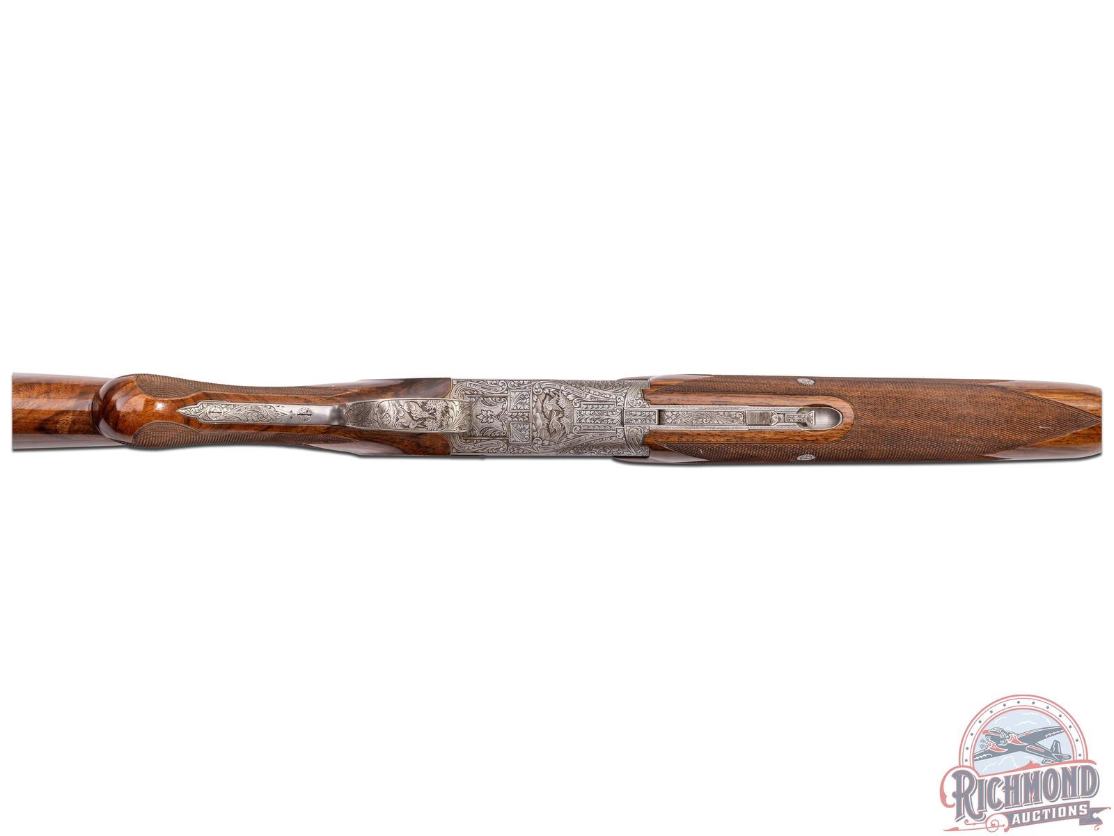 Made in Herstal, Belgium by Browning in 1956. 26" blued fluid steel barrels with ventilated rib, bead front sight, ejectors, and marked with Skeet and Skeet chokes in 12 gauge with 2-3/4" chambers. Satin finished receiver with floral and pheasant scene on left with "Doyen" engraver's signature. Right side has floral and duck scene with bottom having bird and floral scene. Action features gold washed single selective trigger with top tang safety and barrel selector with floral engraved long tang trigger guard. Figured walnut checkered round knob pistol grip stock with added Pachmayr ventilated recoil pad. Matching checkered walnut sporting forearm. LOP: 14". DAC: 1-1/2". DAH: 2". CALIBER: 12 GA. S/N: 49550. FFL STATUS: Curio & Relic.