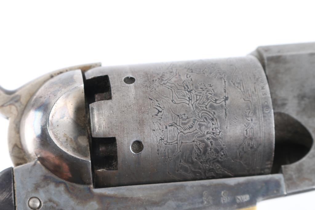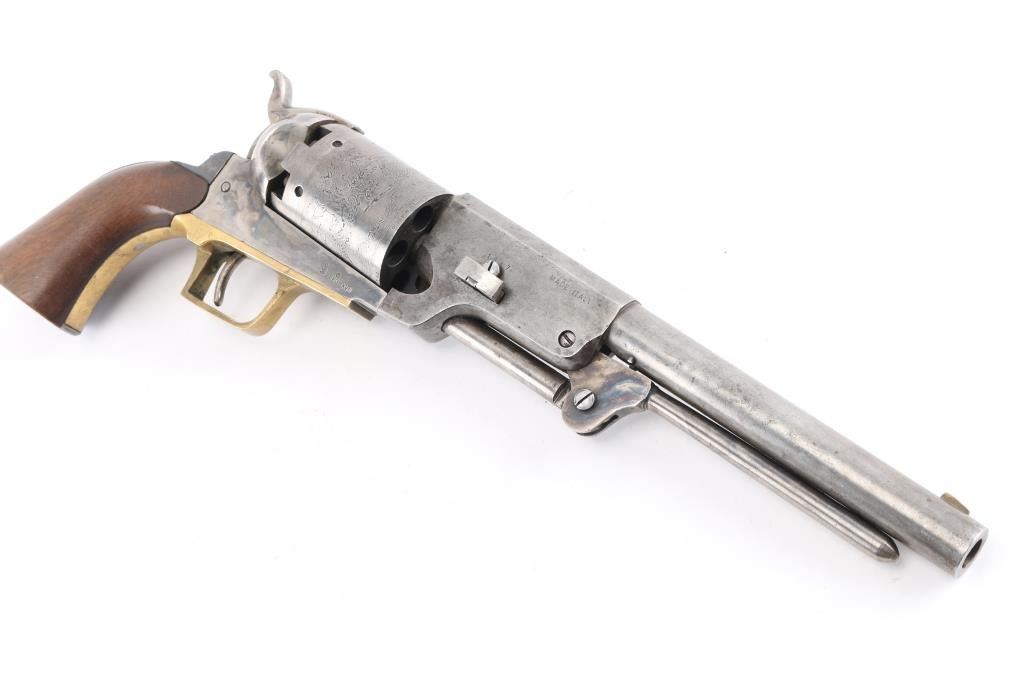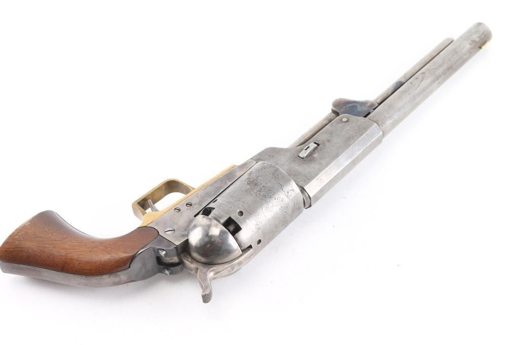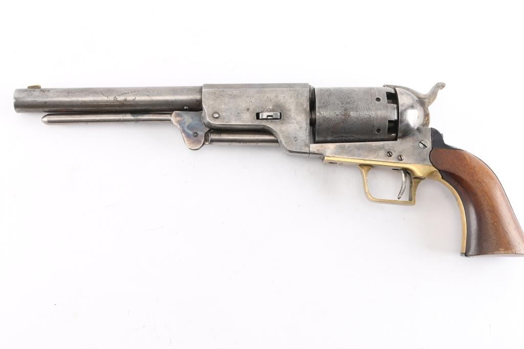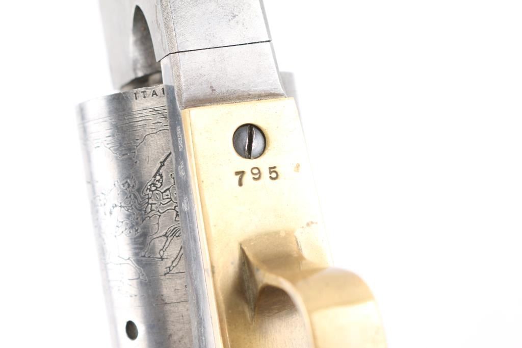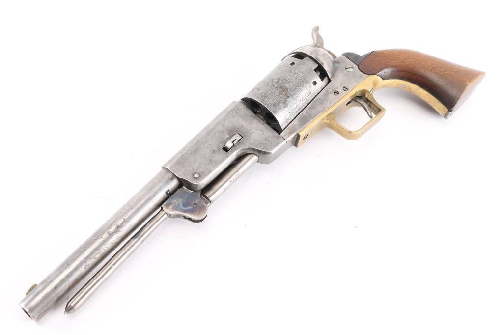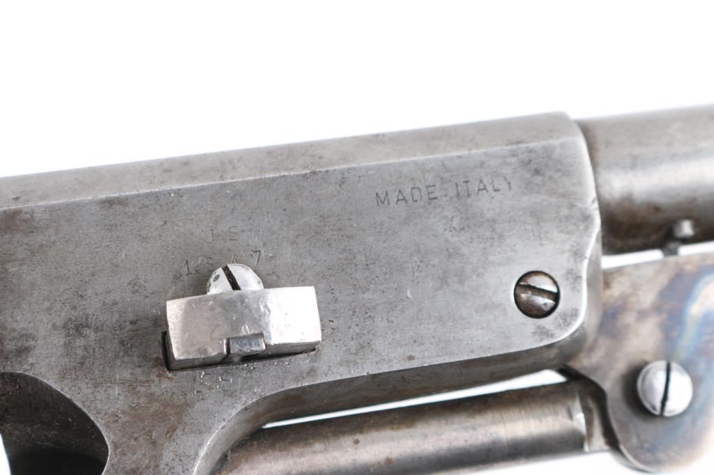 Single action black powder revolver Italian copy of the Colt model 1847 USMR Dragoon, known as the "Walker", manufactured 1975. Imported by the replica Arms co. El Paso TX. Features 9" half round - half octagonal barrel, blade front sight, ‘v’ notch rear sight cut into the hammer lip, loading lever, unfluted six-shot cylinder with roll stamped Indian battle scene, smooth trigger, brass square back trigger guard, knurled hammer spur, and one-piece walnut grip. Bore is very good/bright strong rifling. Blued surfaces have mostly faded to patina gray, some thicker patina or light rust. Frame and lever have traces of case color. Brass triggerguard shows mellow patina. Wood is very good. Italian proofs under barrel & frame.